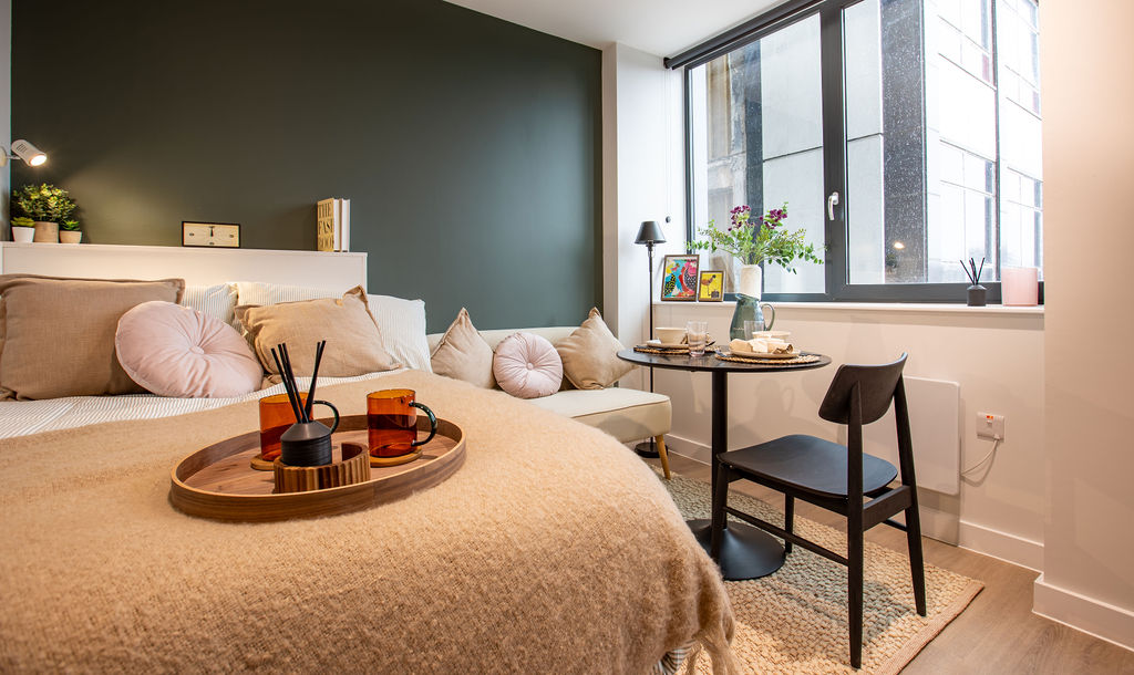 Our Classic Studio rooms (15.5 – 19.8 m²) offer a private, self-contained space with a small double bed, desk, chair, and ample storage including wardrobe, shelves, and drawers. Each studio has its own fully equipped kitchen with fridge/freezer, induction hob, and combination microwave oven, providing the convenience of independent living.