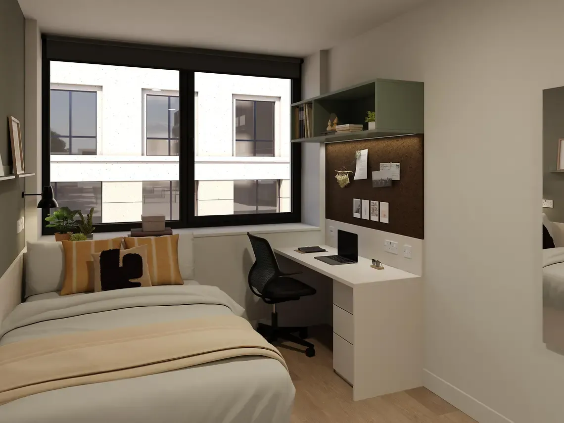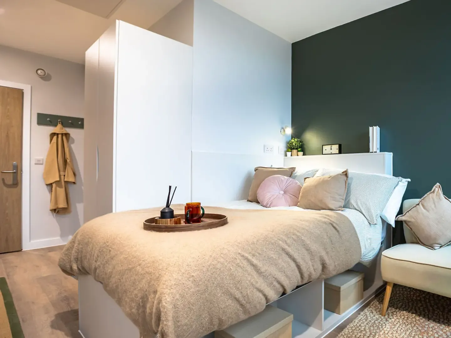 Our Premium Studio rooms (21.1 – 23.7 m²) offer a spacious, self-contained living space with privacy and style. Each studio features a small double bed, desk and chair, and ample storage including a wardrobe, shelves, and drawers. Cook and dine independently in your private kitchenette, complete with fridge/freezer, induction hob, and combination microwave oven. With extra space to relax, study, and make the room your own, the Premium Studio is perfect for students seeking a comfortable, modern, and fully functional home.