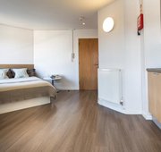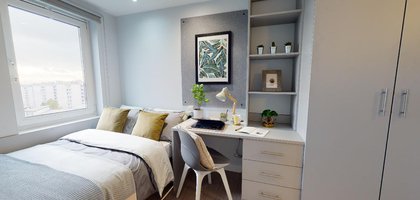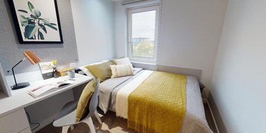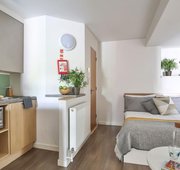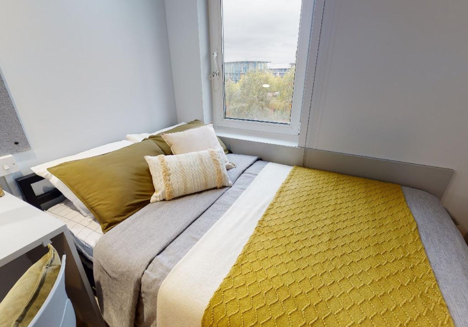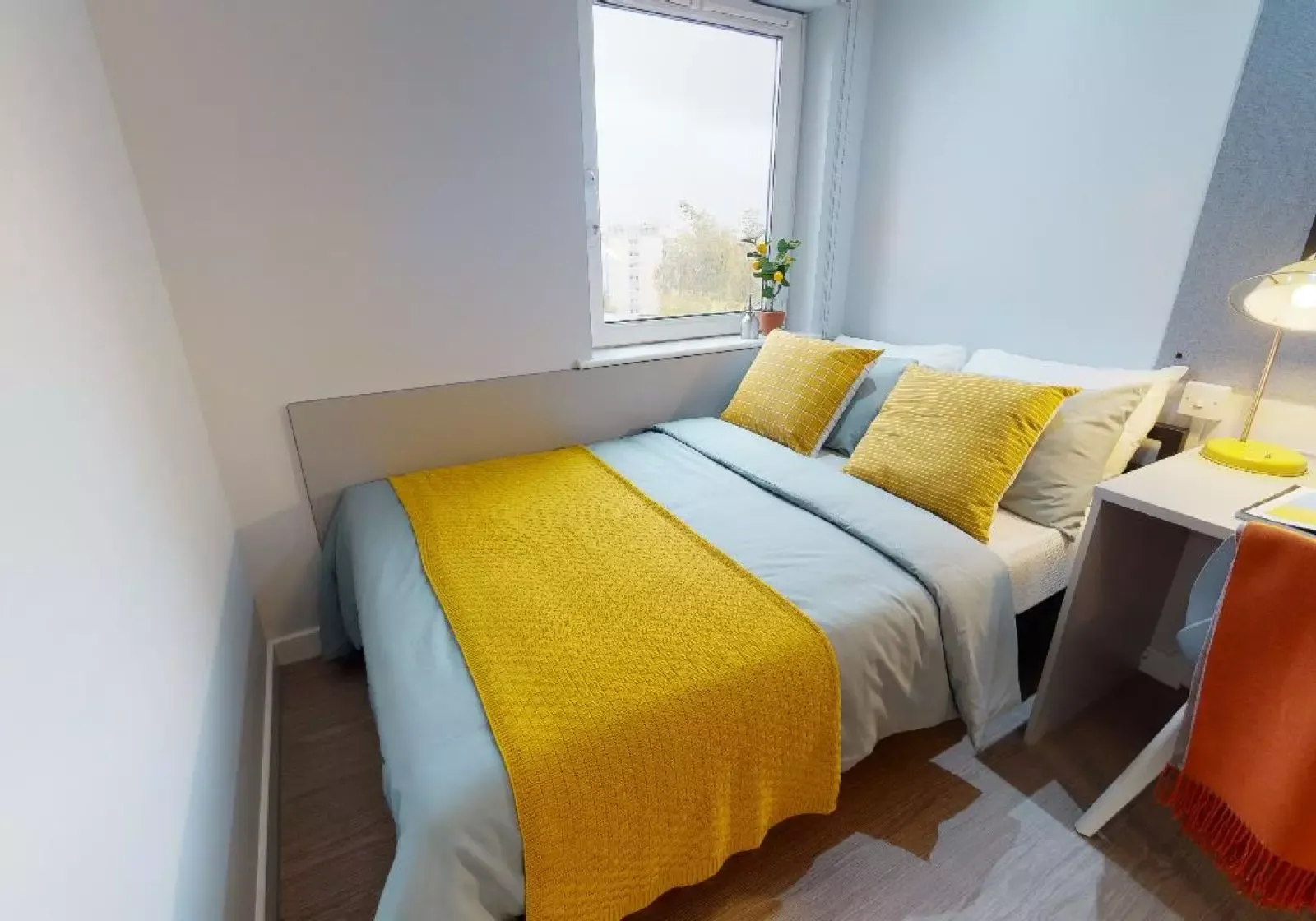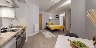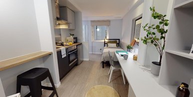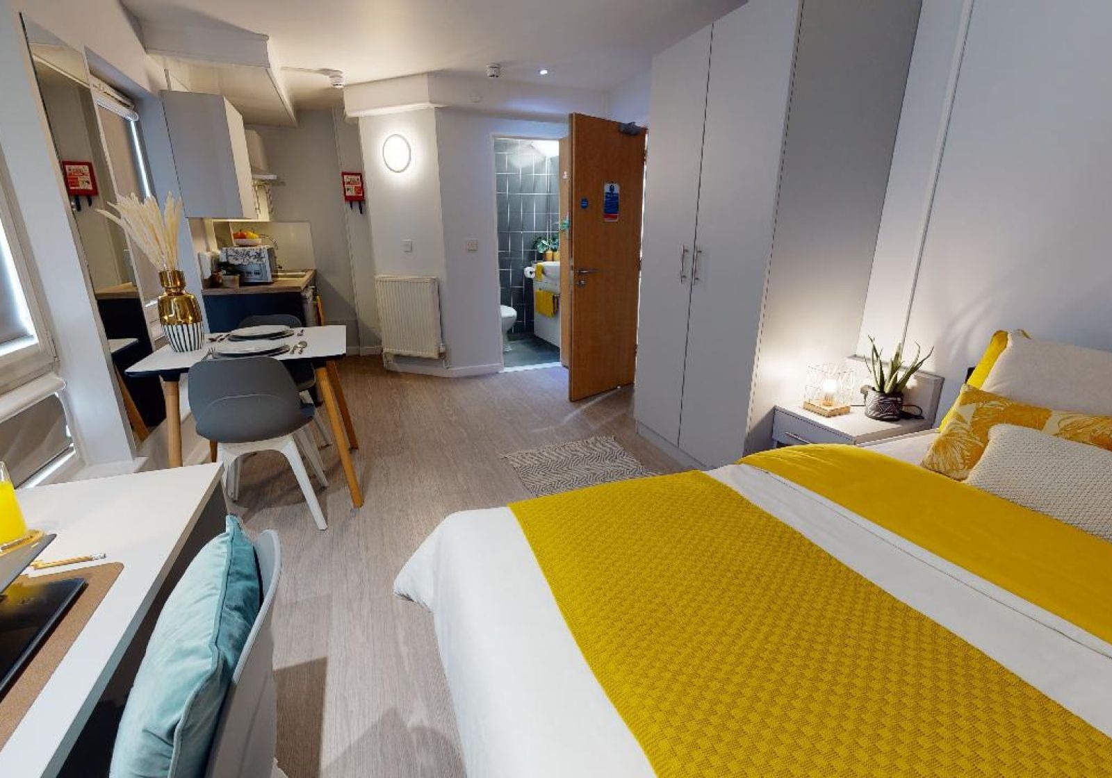 BROD300-031125Convenient, comfortable and self-contained, our bright and modern luxury studios offer the complete student living package presented in an open-plan layout. Featuring a private kitchen, bathroom and double bed, our newly refurbished Gold Studio is suited to the student looking for extra privacy, extra comfort and bags of space. It comes with its own kitchenette, study space and dining area with plenty of light. Everything you need in one place.