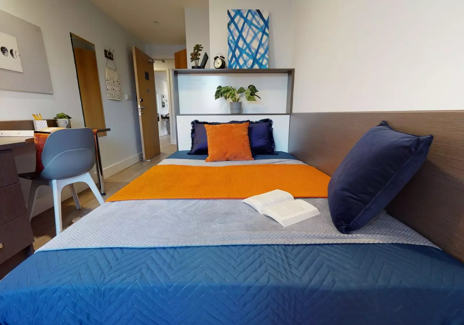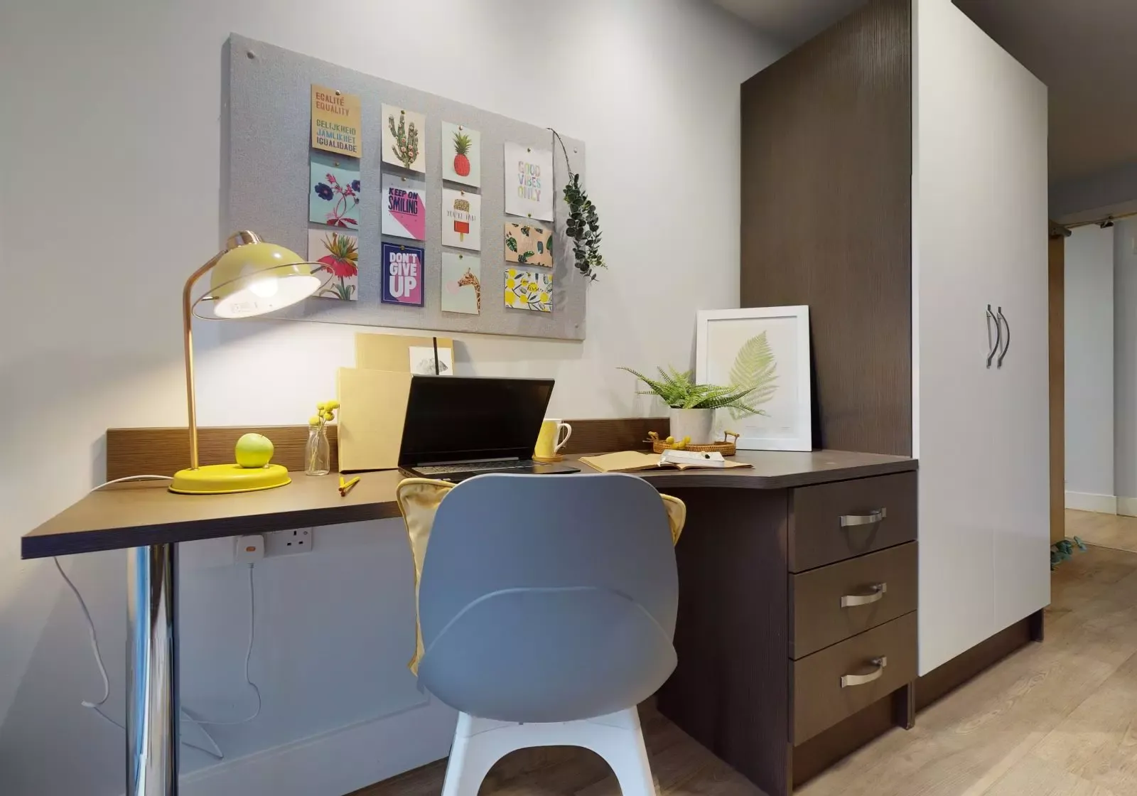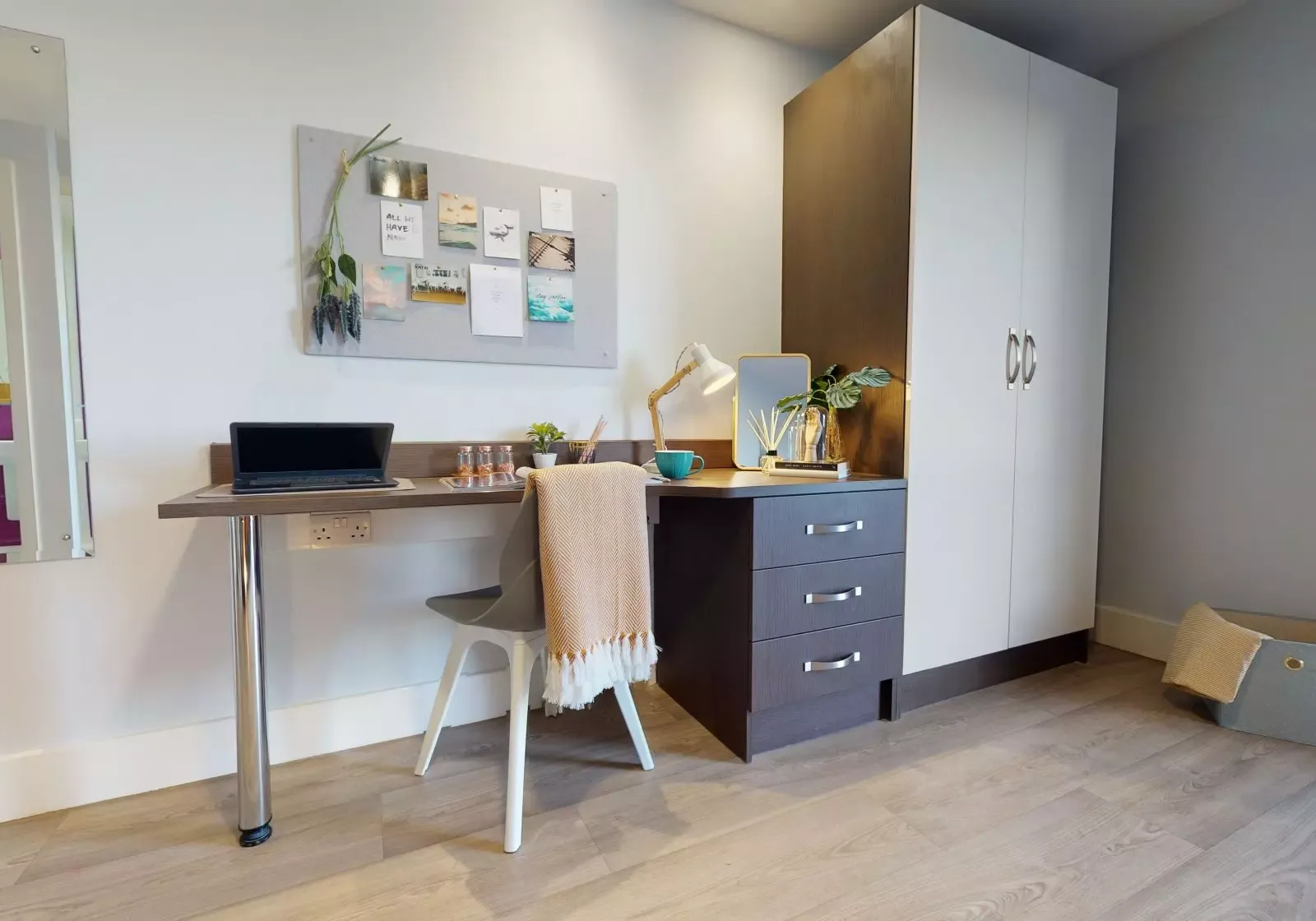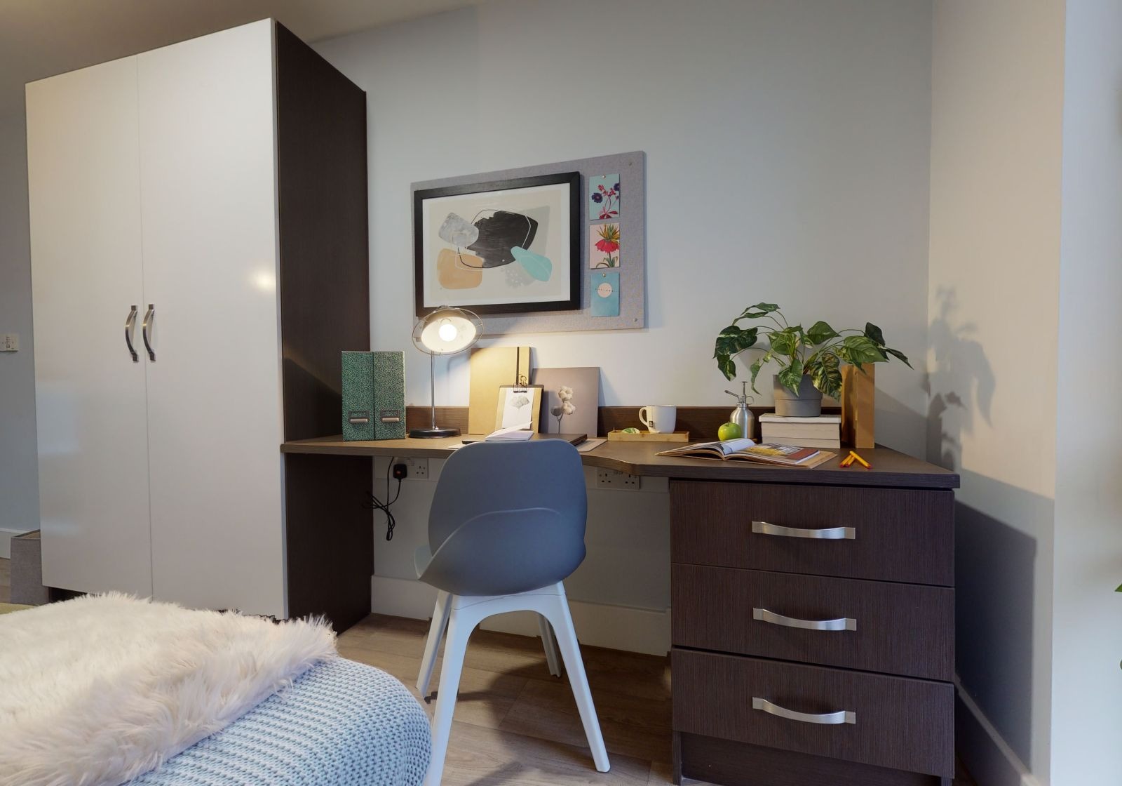PENW300-031125Our standard en suite rooms are fitted with everything you need for a comfortable base in Birmingham. Our Bronze En Suite rooms are approx 13 sq m and feature neutral and contemporary decor with stylish furniture, a small double bed and desk with study chair. You’ll share a fitted kitchen space and communal living area kitted out with a TV and plenty of room for lounging.
