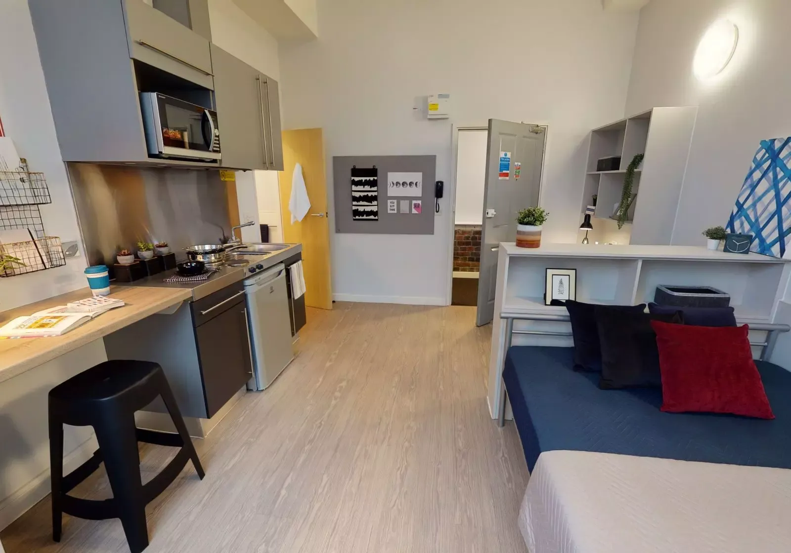 STUD300-031125Perfect for those wanting loads of storage and more space, with all the essential features like private bathroom and kitchen and seating for your friends. The building also features an outdoor courtyard and some great social spaces. Located in the renovated factory chic of Studios 51, our Gold Studio Plus rooms are all unique in shape and give you a generous 24-30 sq m of floor space.