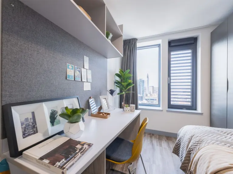 Our Silver En Suites offer a small double bed, loads of workspace and storage, and your own en suite shower room. With a variety of views and room sizes, you'll get a larger room on floors 6 - 8 or a standard room with a better view located on floors 9 - 12.