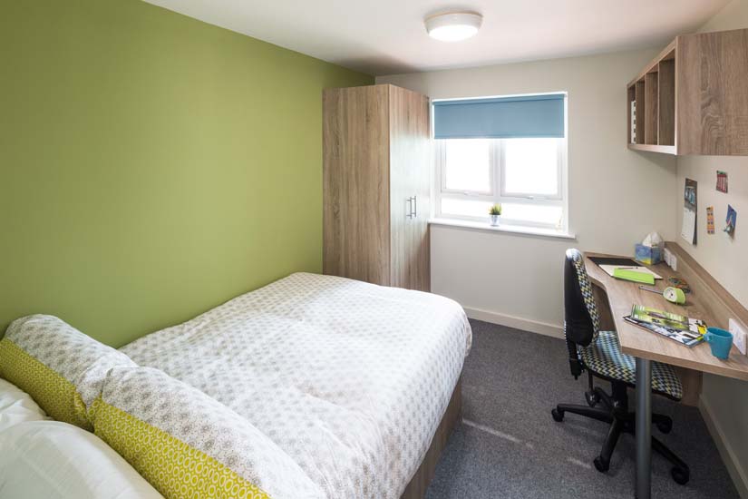 Double bed with under bed storage - Breakfast bar - Coat hooks - Double wardrobe - Pin board - Plenty of storage - Private en-suite shower room - Private kitchen with ceramic hob, combi oven, and fridge freezer - Private room access - Shelves - Stools - Study space with desk and chair