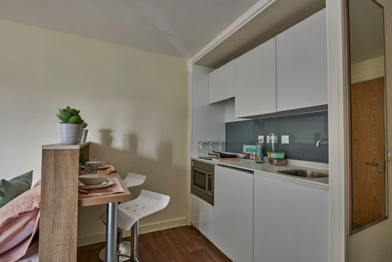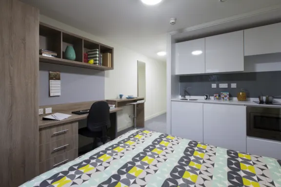 Double bed with under bed storage - Breakfast bar - Coat hooks - Double wardrobe - Pin board - Plenty of storage - Private en-suite shower room - Private kitchen with ceramic hob, combi oven, and fridge freezer - Private room access - Shelves - Stools - Study space with desk and chair - Dual occupancy available