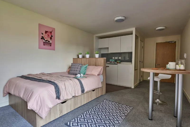 If you’re looking for extra space and a modern feel, the Premium Studio offers room sizes between 19.5m² and 20m², giving you more room to live, study, and relax. Inside, you’ll find a double bed with under-bed storage, a dedicated study space with a desk and chair, and ample storage, including a double wardrobe, shelves, and a pinboard to personalise your space. The breakfast bar is ideal for casual dining or study breaks. Your private en-suite shower room ensures complete privacy, while the private kitchen, equipped with a ceramic hob, combi oven, and fridge freezer is perfect for meal prep.