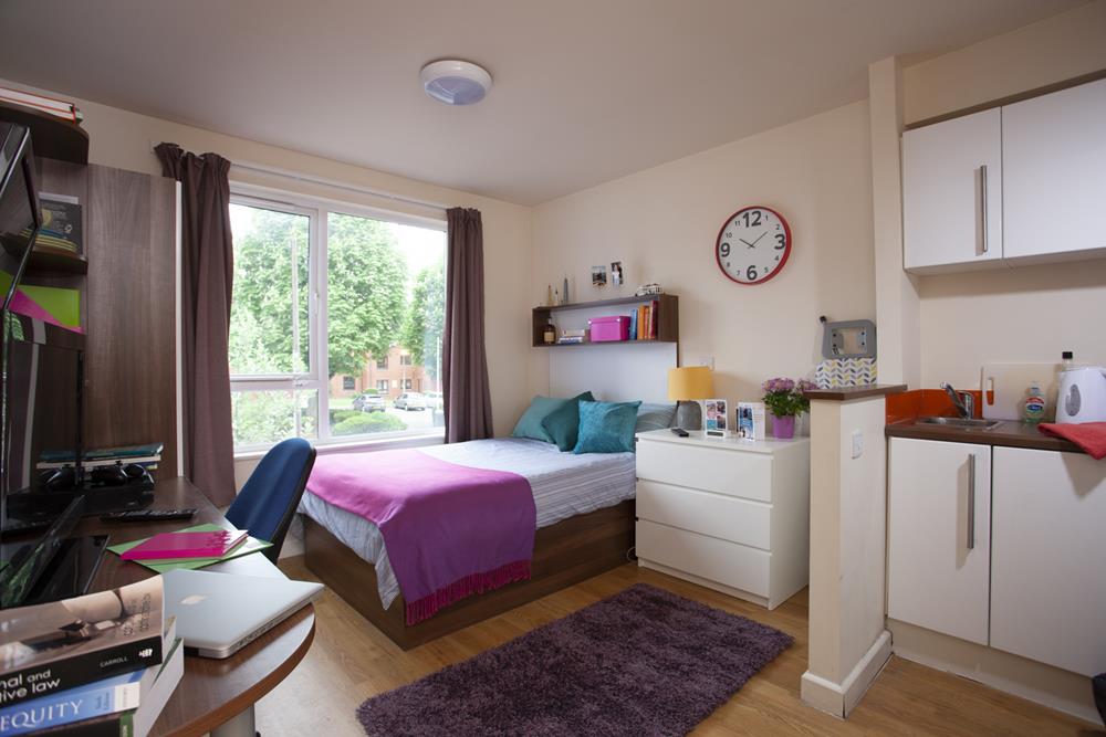 Spacious 20 sqm; ¾ size bed; Ample storage with wardrobe, drawers and shelves; Study area with desk, adjustable office chair and drawer space; Self contained kitchen with full size oven, ceramic hob with extractor, full size fridge with freezer box; Dining table and chairs; TVs in all apartments; Spacious en-suite bathroom; Located on the third floor
