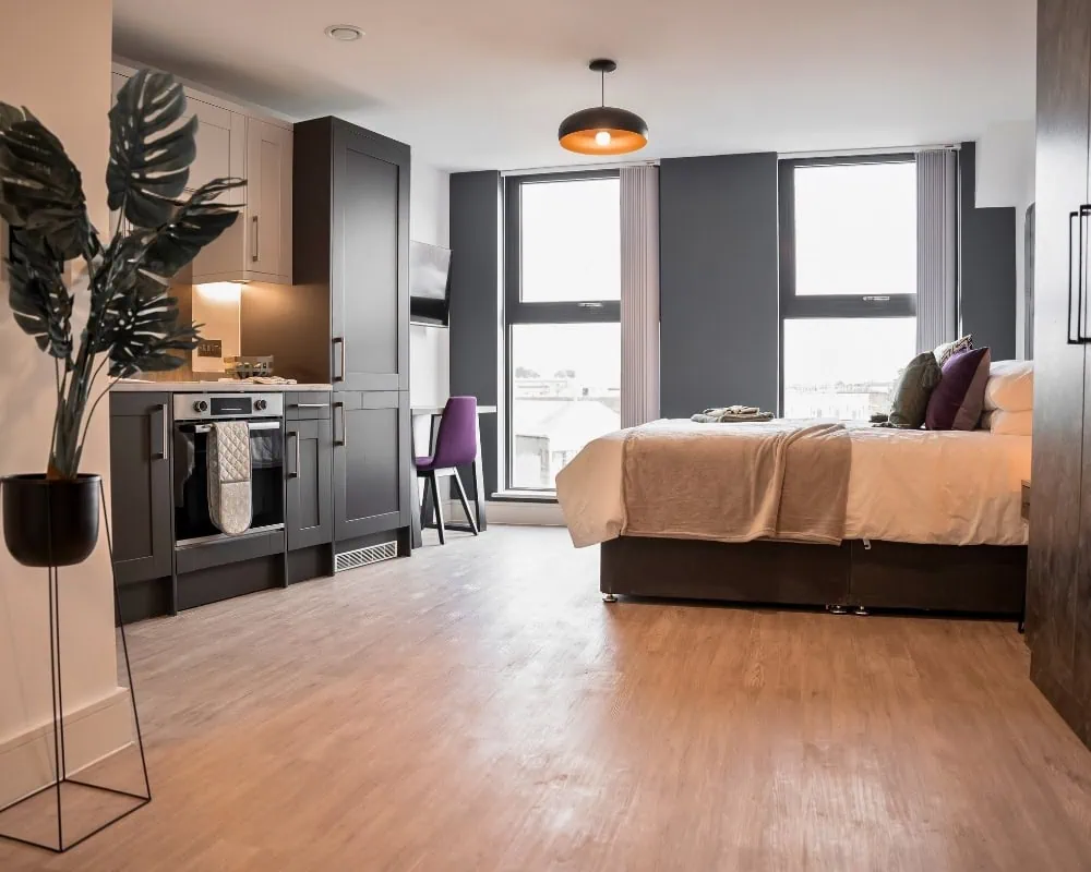 Our Studio Edition III room, with 21.8 to 24.2m², gives you the perfect blend of space and luxury. Relax in a king-size bed while watching your favourite shows on the 40″ Smart TV where the super-fast WiFi (up to 250Mbps) supports all your streaming needs. The studio also comes with a study area and ample storage space to keep your belongings securely. Enjoy 24-hour gym access, a residents’ cinema, and secure living with the video door entry system. The en suite shower room adds privacy, and you can cook your favourite meals in the private kitchen. Outdoor bike storage is also available for your convenience.