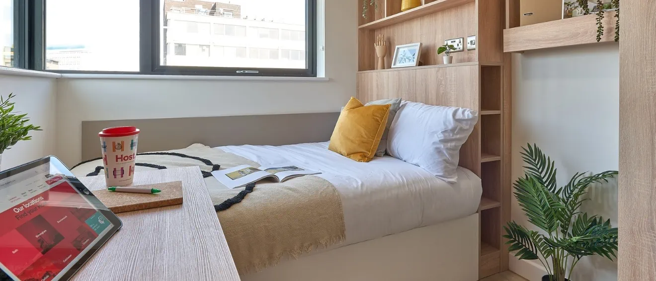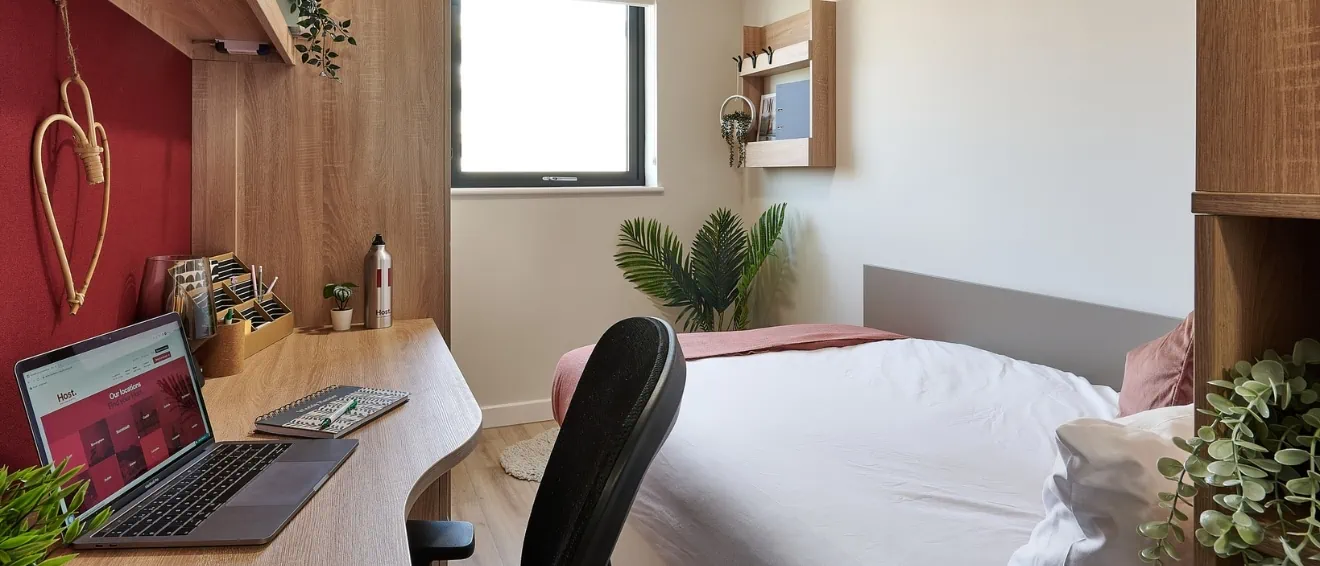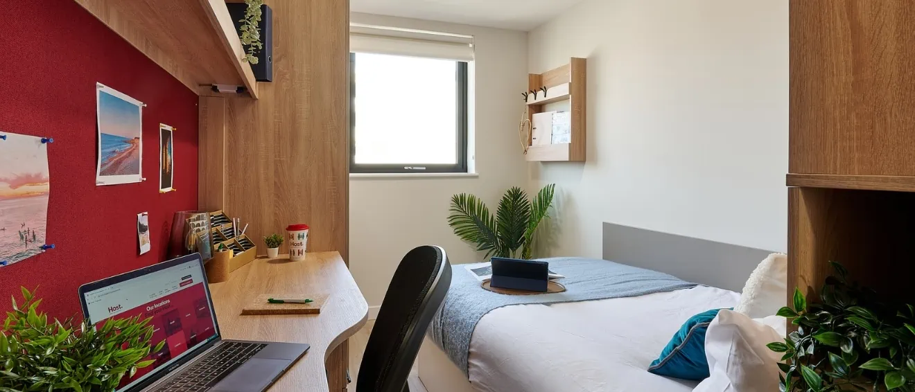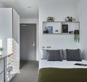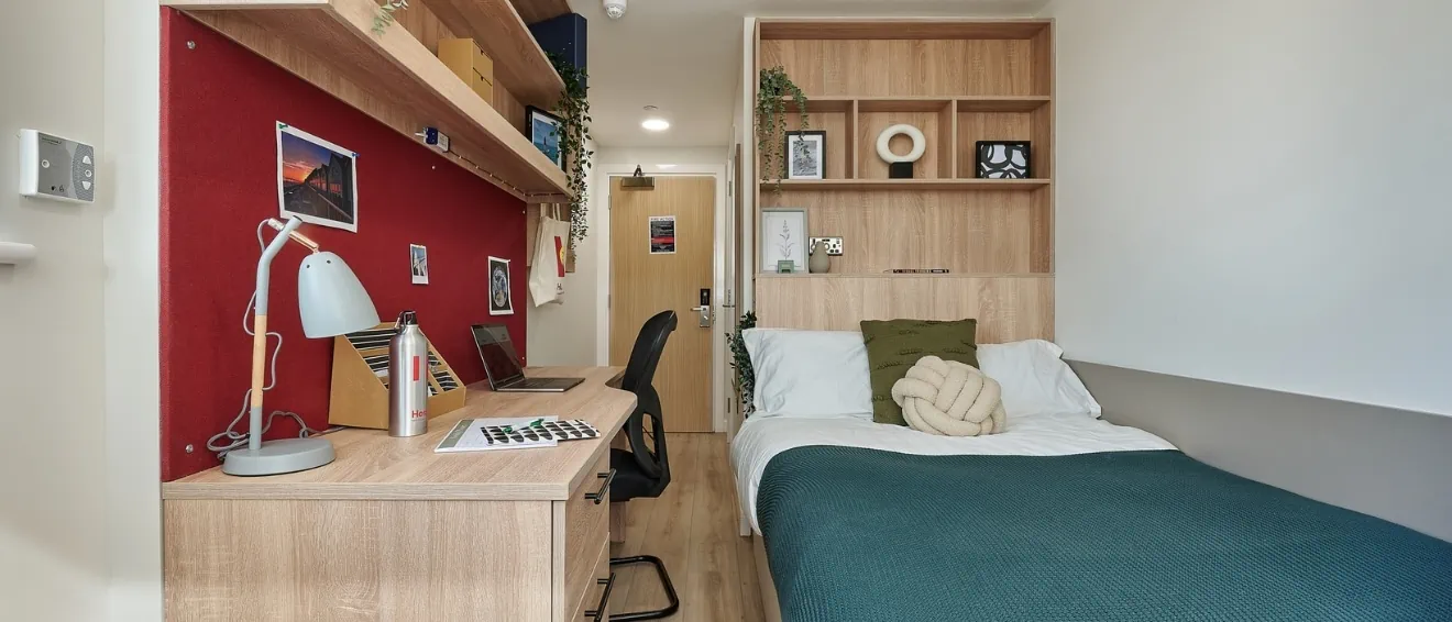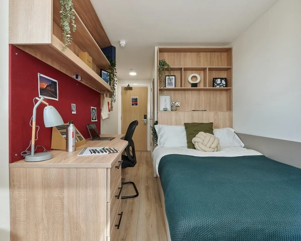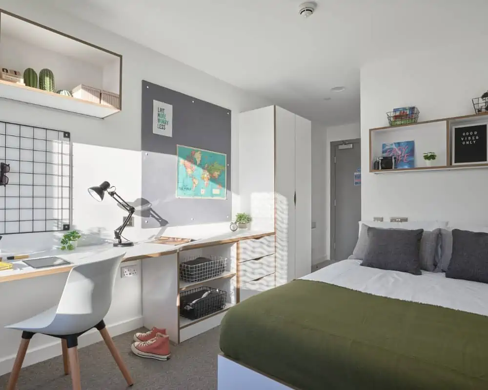 Room size- From 12.8m², 3/4 double bed, Electric heater, Wardrobe, Bedside shelf, Drawers, underbed storage & coat hooks, Large desk and chair, Bookshelves & noticeboard, Freeview TV