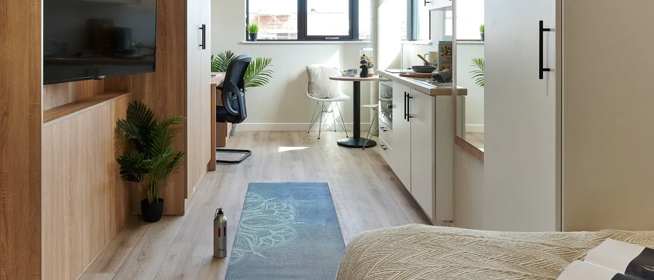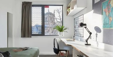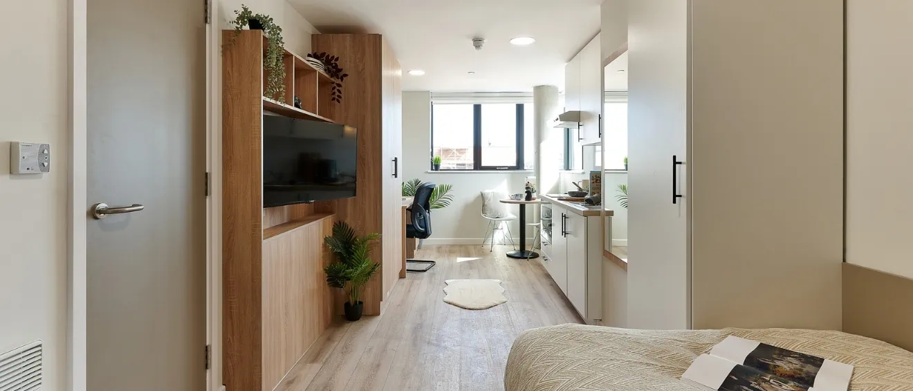 Room size: From 23.1m², South facing studios from 19m², Private Balcony, 3/4 double bed, Wardrobe, bedside shelf & table, drawers, underbed storage & coat hooks, Large desk and chair, bookshelves & noticeboard, Freeview TV
