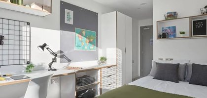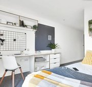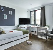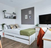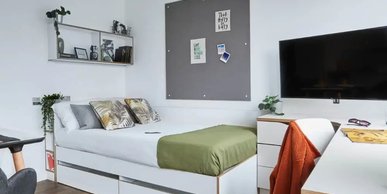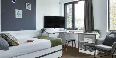 Room size- From 12.6m², 3/4 double bed, Electric heater, Wardrobe, Bedside shelf, Drawers, underbed storage & coat hooks, Large desk and chair, Bookshelves & noticeboard, Freeview TV