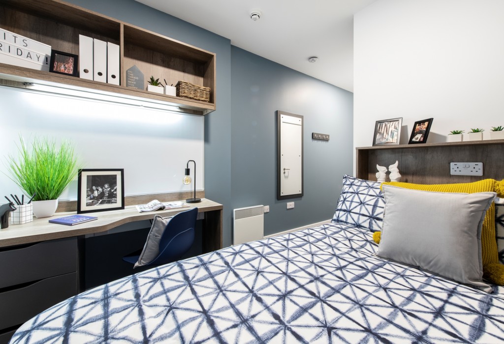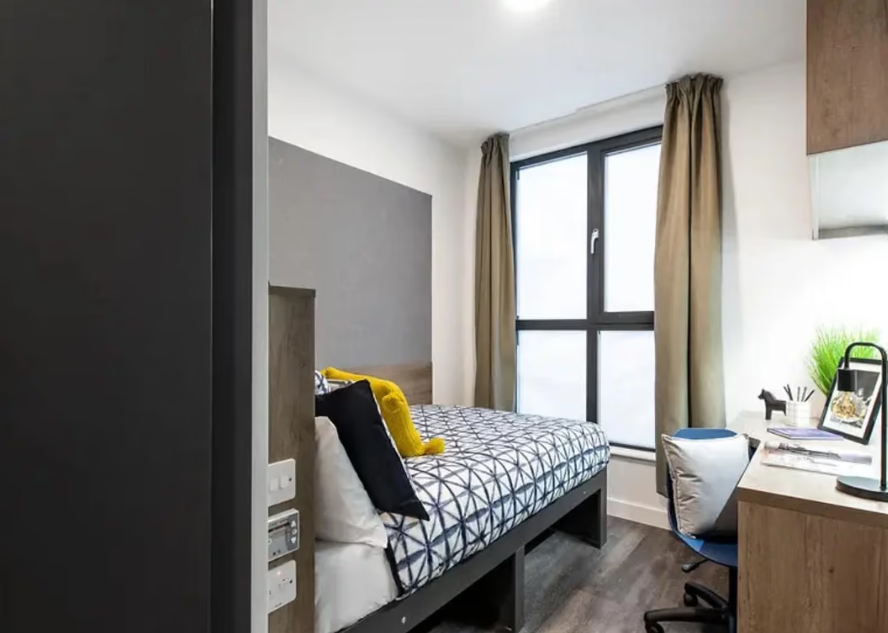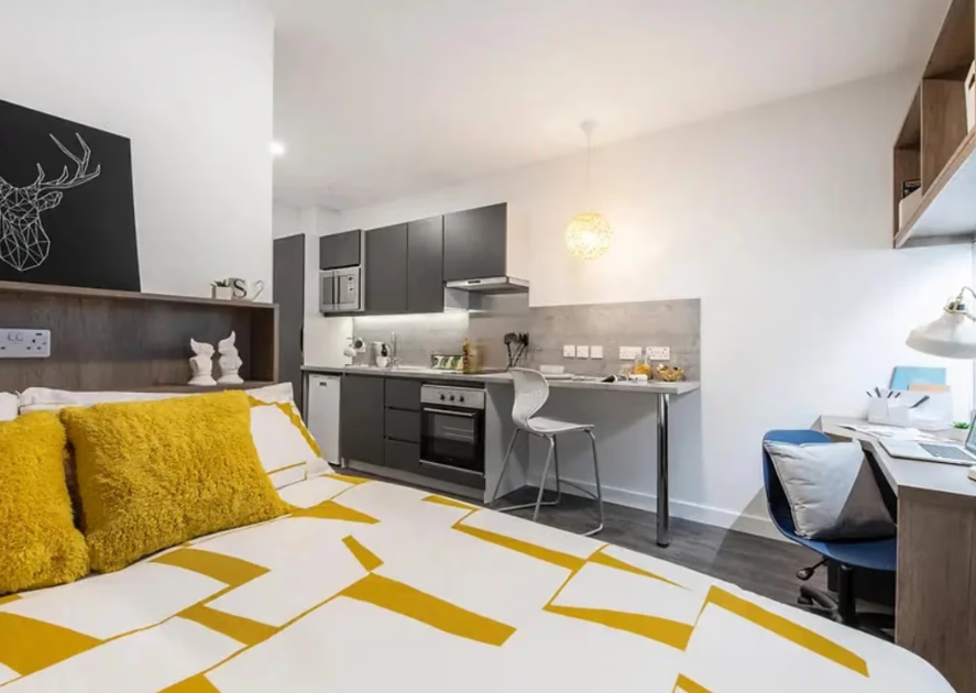 This larger, fully furnished space offers a little extra comfort, with top-quality furnishings and a prime location within the building. Perfect for those who like their privacy and a bit of luxury, while staying close to all the campus action. Your studio comes complete with premium extras—plush bed, spacious desk, comfy chair, dresser, and loads of shelf space. Plus, you get your own kitchen, giving you total freedom to cook and live on your own terms.