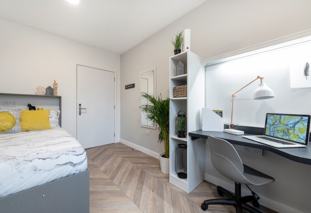 Rooms range from 12.2m2 - 12.8m2. Share a homely kitchen-diner in a 5-8 bed flat whilst enjoying the privacy of your own modern room with a swanky bathroom to match! Sizes of this room type will vary. Your room will have plenty of storage space and a small double bed. These are great value apartments located on the ground floor and have limited availability.