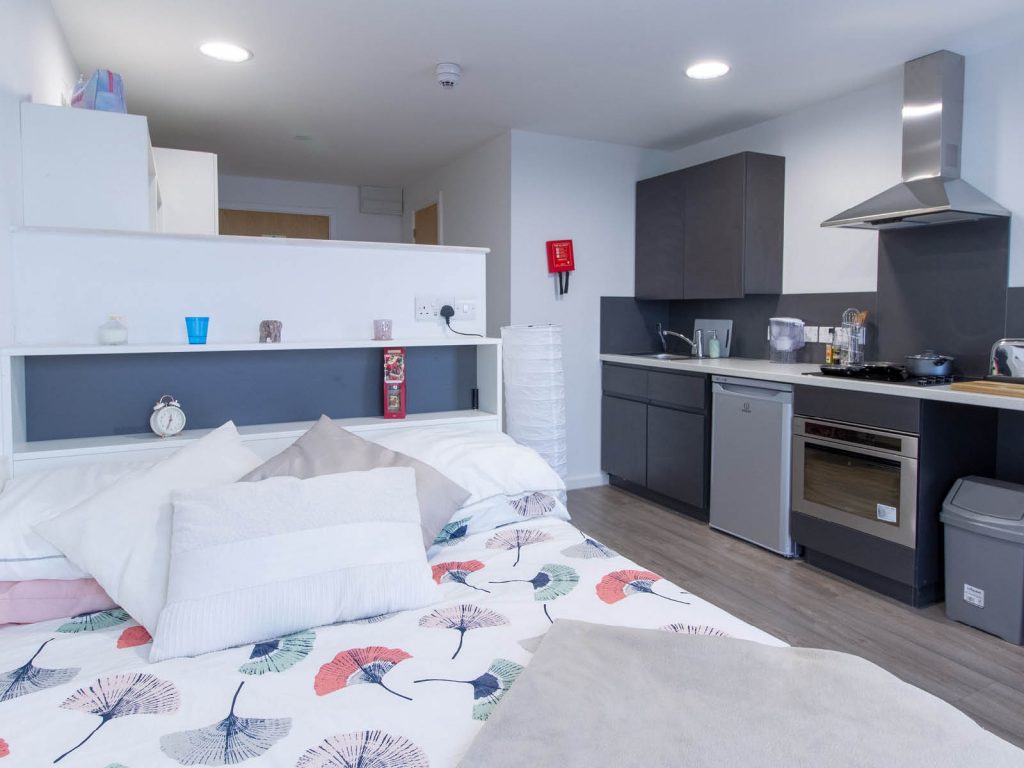 Self-contained studio living starts here for you and perhaps your plus one. If you choose to share the en-suite shower room, double bed, bags of storage, fitted kitchen and study area, there’s no more extra pay.