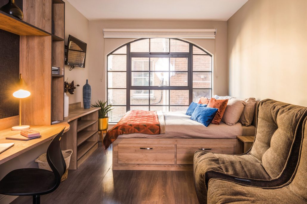 Room Size:- 18.9m2 4ft Double bed Bedside table Desk with 3 drawers and study chair Seated bed bag chair 32″ Television (TV Licence not included) Double wardrobe Under bed storage Low level and high level shelving Noticeboard USB ports Mirror Private ensuite. Corian worktop Integrated combination oven Integrated fridge with freezer tray Four ring induction hob Built in extraction Breakfast bar with two stools Medium sized window Multipole Windows