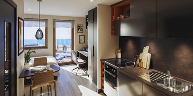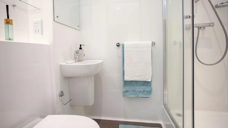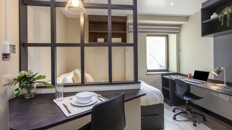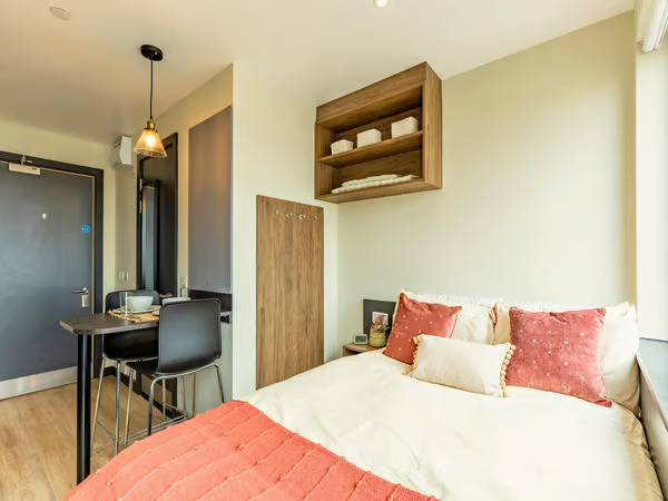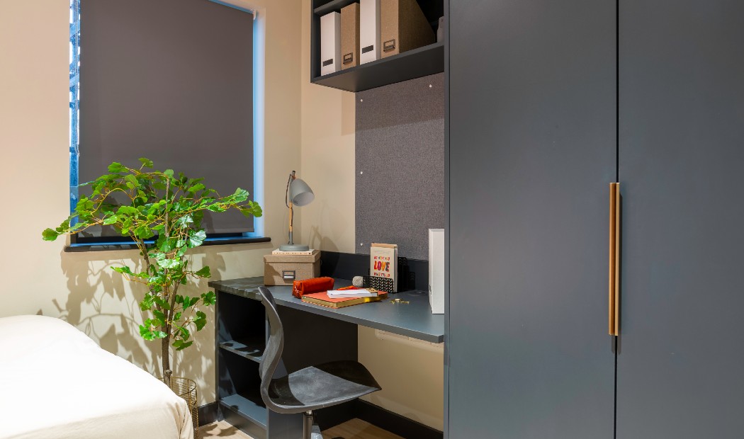 Experience comfort and style in our Classic Plus Studio, located on floors 1 – 5, sized 15.1 – 17.7 square metres. Featuring a 3/4 size double bed, plenty of storage, and study desk with chair. The room includes an en-suite bathroom with a shower and WC, along with a full-length mirror and pinboard. Cook meals using the 4-ring hob with extractor and built-in microwave combi oven. With ample storage space and modern amenities, this studio provides the perfect environment for comfortable student living. Some Classic Plus Studios also feature a breakfast bar, depending on the layout, giving you extra space to eat, study, or just enjoy your morning coffee.