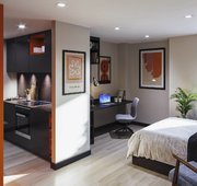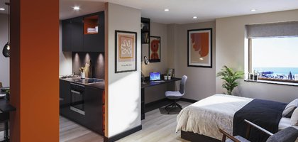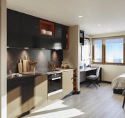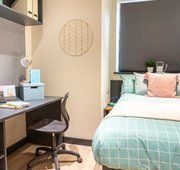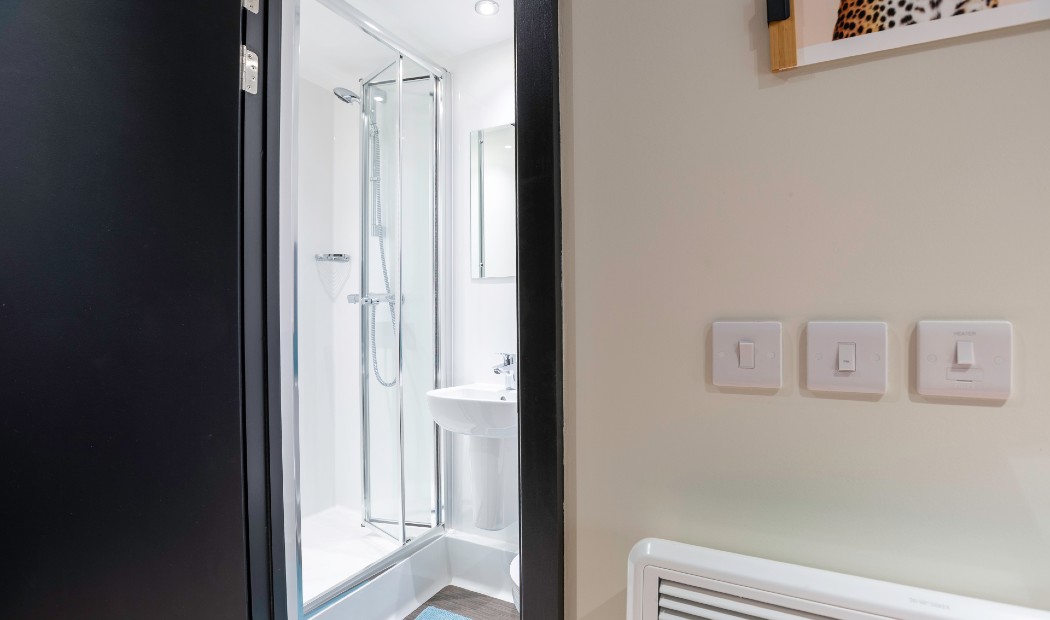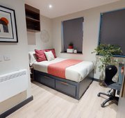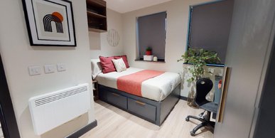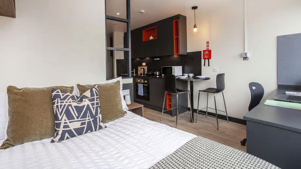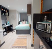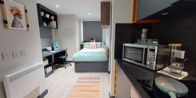 Room sizes may vary ¾ size double bed with under bed storage 2-ring hob with extractor Bedside table Breakfast bar En-suite bathroom with shower and WC Full-length Mirror Integrated fridge with freezer compartment Microwave oven Pinboard Stool Study Desk with drawer space and chair Wardrobe