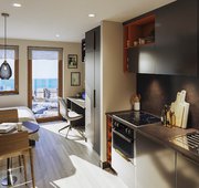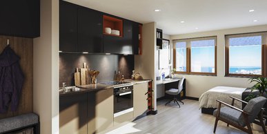 Room sizes may vary from 28.1 – to 28.9m2 ¾ size double bed with under bed storage 2-ring hob with extractor Breakfast bar Chair En-suite bathroom with shower and WC Full-length Mirror Integrated fridge with freezer compartment Microwave oven Pinboard Two stools Study Desk with drawer space and chair Two wardrobes