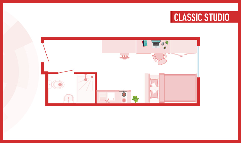 Room sizes may vary from 18m2 to 18.7m2 ¾ size double bed with under bed storage 2-ring hob with extractor Bedside table Breakfast bar En-suite bathroom with shower and WC Full-length Mirror Integrated fridge with freezer compartment Microwave oven Pinboard Stool Study desk with drawer space and chair Wardrobe