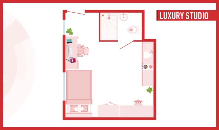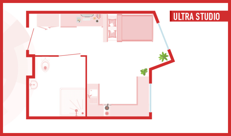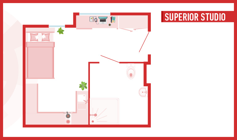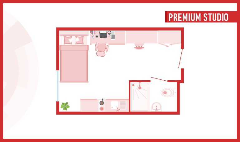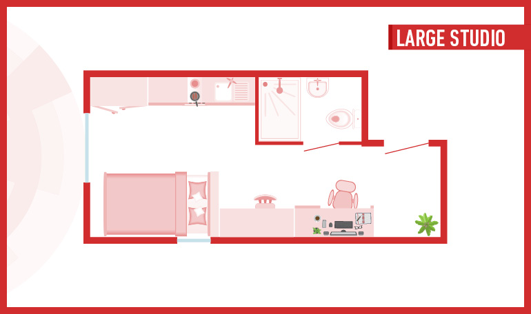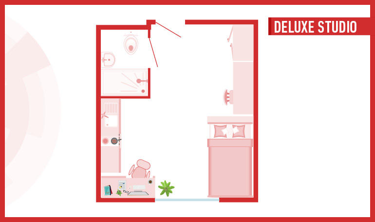 Room sizes may vary from 24.2m2 to 24.7m2 ¾ size double bed with under bed storage 2-ring hob with extractor Bedside table Breakfast bar En-suite bathroom with shower and WC Full-length Mirror Integrated fridge with freezer compartment Microwave oven Pinboard Stool Study desk with drawer space and chair Wardrobe