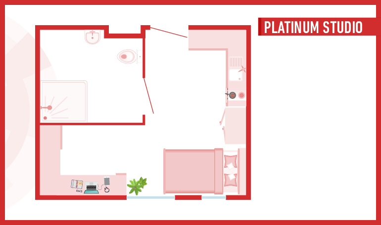 Room sizes may vary from 18.9m2 to 19.2m2 ¾ size double bed with under bed storage 2-ring hob with extractor Bedside table Breakfast bar En-suite bathroom with shower and WC Full-length Mirror Integrated fridge with freezer compartment Microwave oven Pinboard Stool Study desk with drawer space and chair Wardrobe
