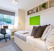 As spacious but private retreat from the shared living space, each en-suite room is 14sq. metres and has a 3/4 bed, storage, wardrobe with full length mirror, desk space and en-suite shower room. The cluster flat offers contemporary communal living, with a shared kitchen/living area and a complimentary Smart TV.