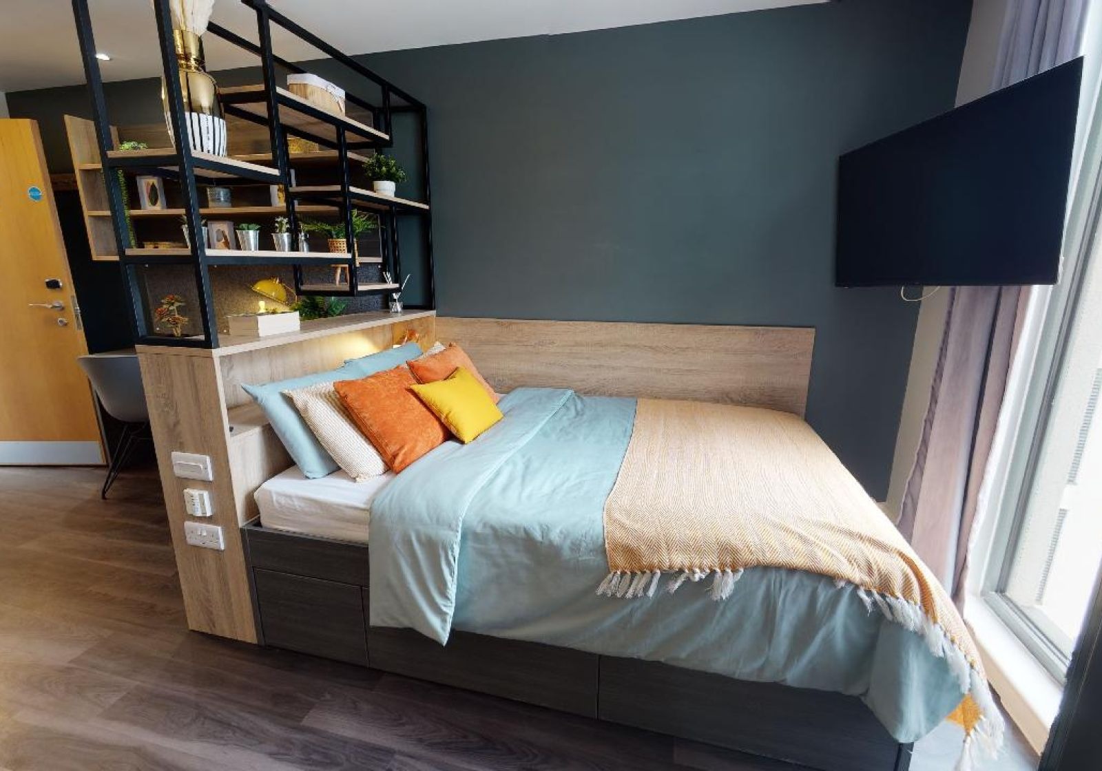 ABAC750-130825Private studio Double bed TV in bedroom Shower These smart studios provide a stylish living space with a bed, study area, storage and an en suite shower room. You will also have your own kitchenette for extra independence.