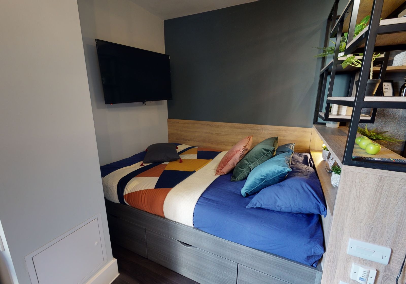 ABAC750-130825Private studio Double bed TV in bedroom Shower The Silver Studio Plus gives you more space than its Bronze equivalent, and includes a bed, storage, study area and shower room, as well as a useful kitchenette to maximise your independence.