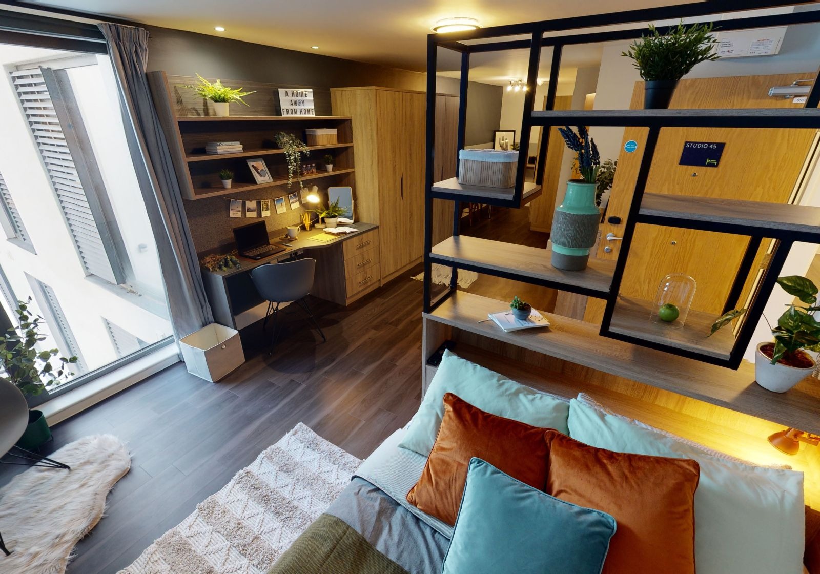 ABAC250-031125With a massive 21-25 sq m of living space, loads of storage and contemporary decor with wooden floors, our Gold Studios are a great upgrade from the usual student living experience. You’ll have your own private kitchenette and bathroom plus double bed, TV with paid-up licence, breakfast bar with stylish bar stools plus study desk and chair. With communal social spaces in the building featuring a pool table and a piano, you get the best of both worlds.