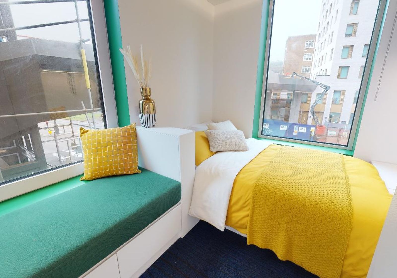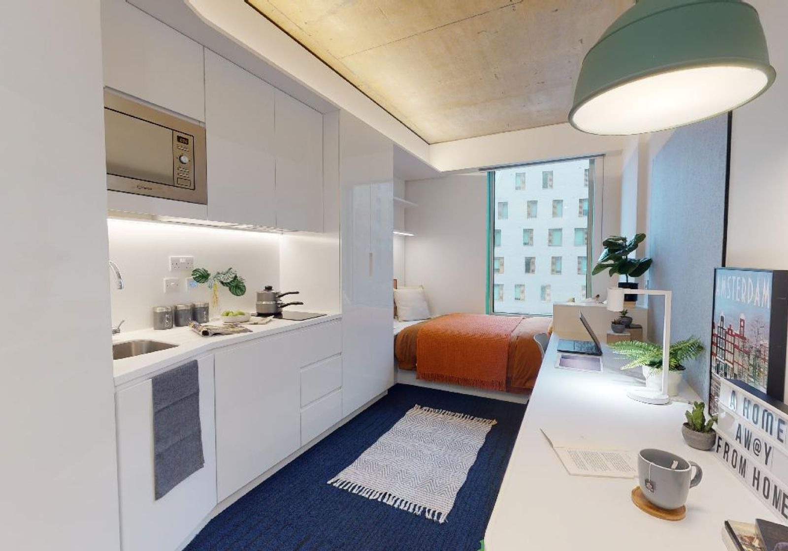 BRIG250-031125The largest studio in the building provides a great living experience, with big windows, a king-size bed and a breakfast bar dining area. Located on floors 9-14. Our Diamond Studio Plus gives you maximum space and includes a king-size bed, study desk and chair, an en suite shower room, dining area and a well-equipped kitchenette. This studio offers lots of storage space including a wardrobe, and enjoys the use of our onsite social and study areas. Windows in some rooms are non-openable with a fresh air circulation system.