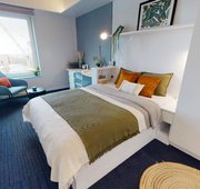 BRIG250-031125This Platinum Studio comes with a king-size bed and has all you need for an independent student life. Located on floors 4-6. Stylish and spacious, the Platinum Studio includes a king-size bed, study desk and chair, an en suite shower room and a well-equipped kitchenette. This studio offers lots of storage space including a wardrobe, and enjoys the use of our onsite social and study areas. Windows in some rooms are non-openable with a fresh air circulation system.
