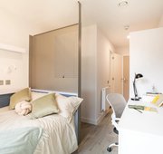 Room sizes vary between 16.79m2 and 18.85m2 - Your own private studio - Private en-suite with shower and WC - Double bed with storage and bedside light - Wardrobe - Study desk, chair and storage - Bookshelf - Pin/Noticeboard - Mirror - Coat hooks -- What's in the kitchen? - Your own private kitchen - Breakfast bar with seating - Kitchen with preparation area, sink, combi oven and induction hobs - Storage cupboards - Fridge/freezer