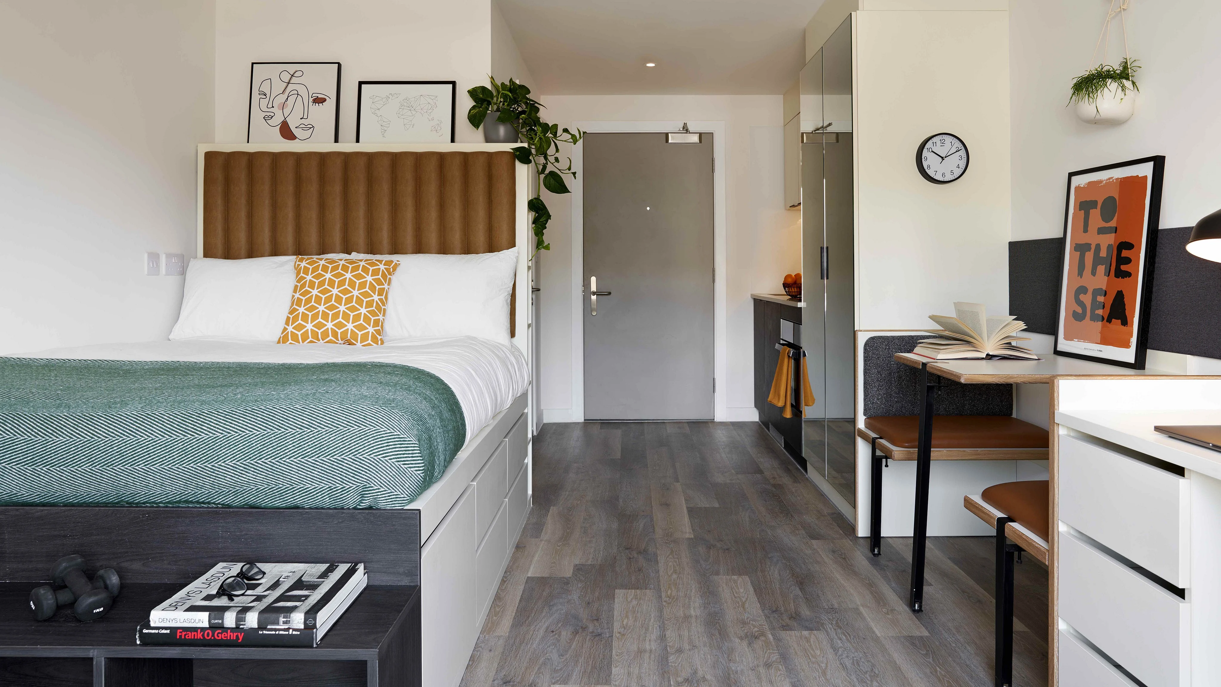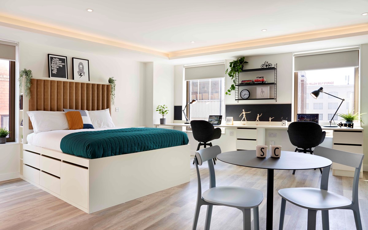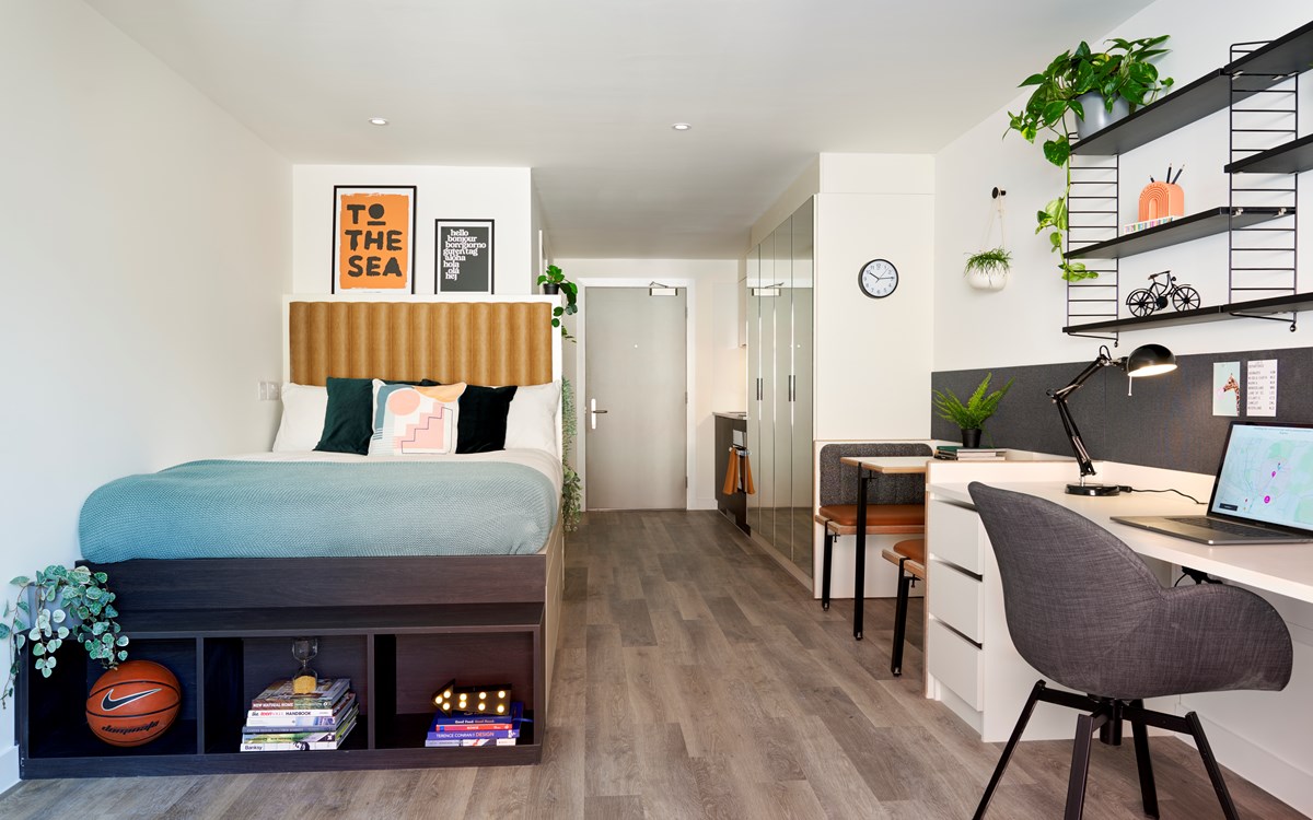 Our studios are all contemporary in design and include the latest technology. They each come with their own en-suite bathroom, private kitchen area and plenty of space for you to study or relax. 43.6m2 average size