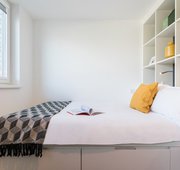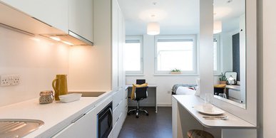 This room comes with a stylish kitchenette, private ensuite, double bed and lots of study & storage space. Bathroom Ensuite Kitchenette Private Room size 17m² Utility bills All included 4ft double bed Plenty of storage space Hob, combi microwave & fridge-freezer