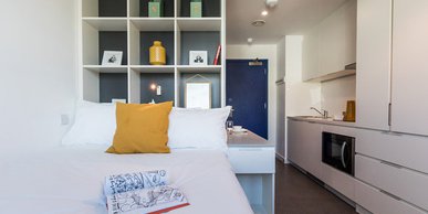 Vogue Studios student accommodation, a Brighton complex, offers modern minimalist studios. The studies are all Deluxe and are separated into two groups where students can find a comfy double bed, plenty of space, your private en-suite shower, and a kitchen area waiting for you when the term starts.