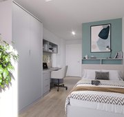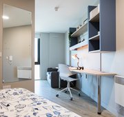 These private studio rooms will feature a kitchenette, dining area, ensuite bathroom and all you need from your student room, with a comfy double bed, desk and ample storage. Double bed, study area and plenty of storage Private kitchen with combination microwave oven, 2 ring electric hob & small fridge freezer Double occupancy FREE of charge