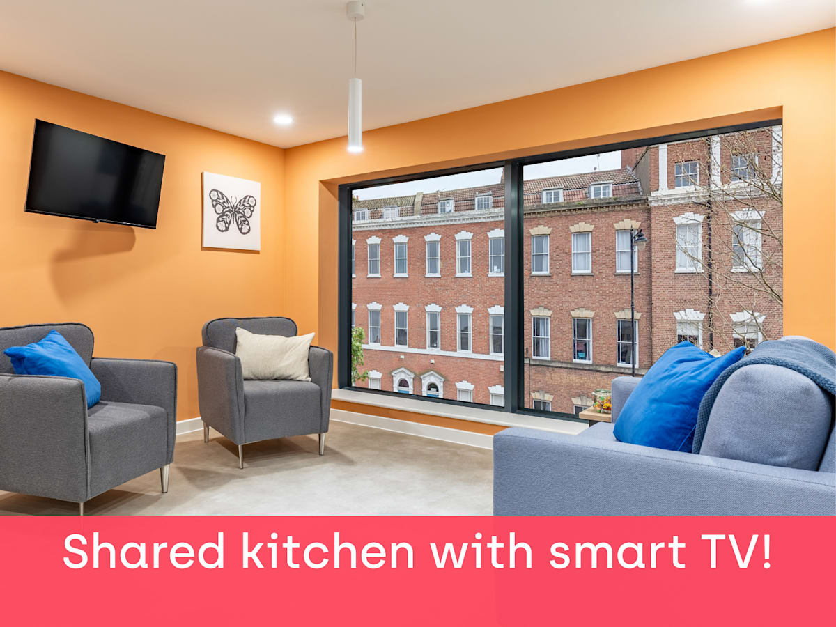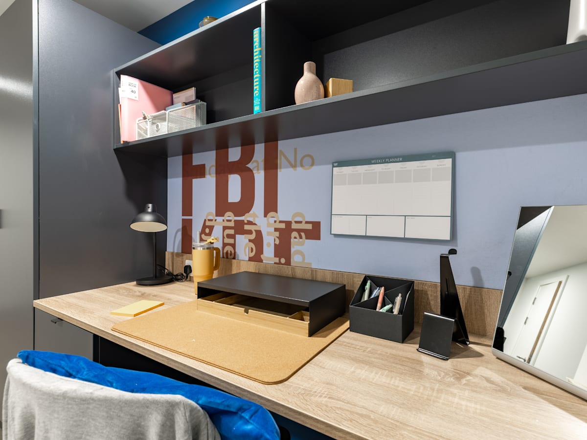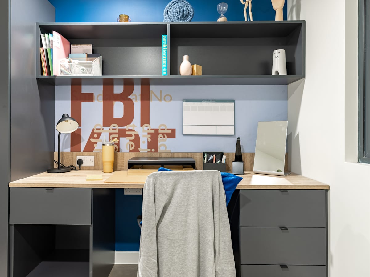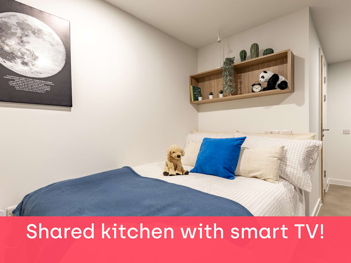 Each of our en suite rooms comes with a small double bed, loads of storage, study workspace and your own en suite shower room. Plus, you can also relax in the shared kitchen with a 42" Smart TV, living room or communal areas.