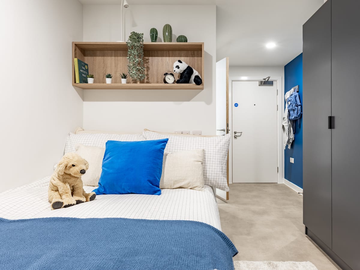 Each of our en-suite rooms comes with a small double bed, ample storage, a study workspace, and your own en-suite shower room. Plus, you can also relax in the shared kitchen, living room, or communal areas. We have accessible rooms available for this room type. Please speak to the Residents Team to find out more.