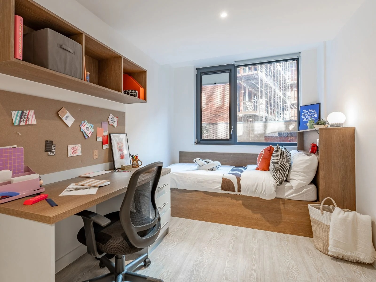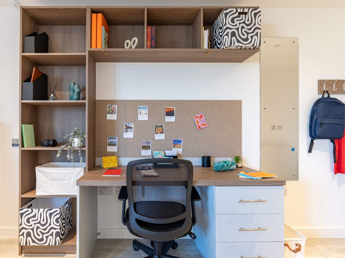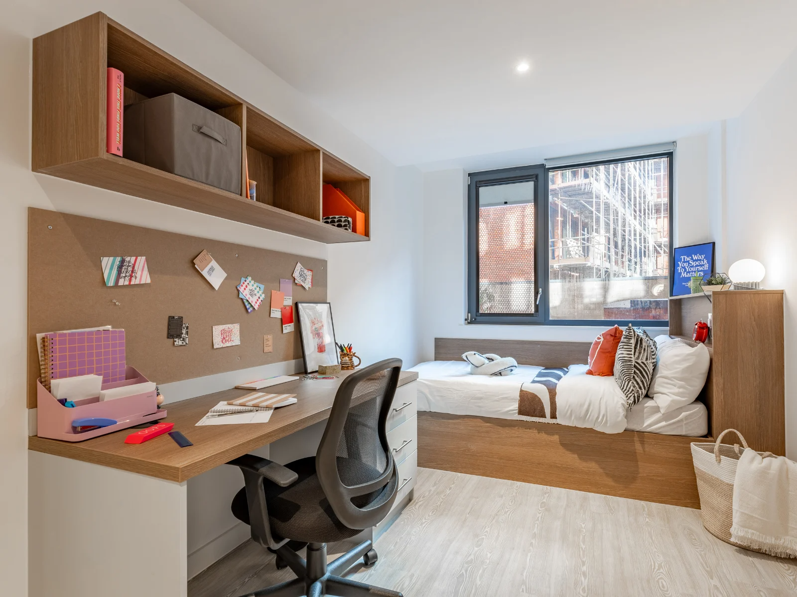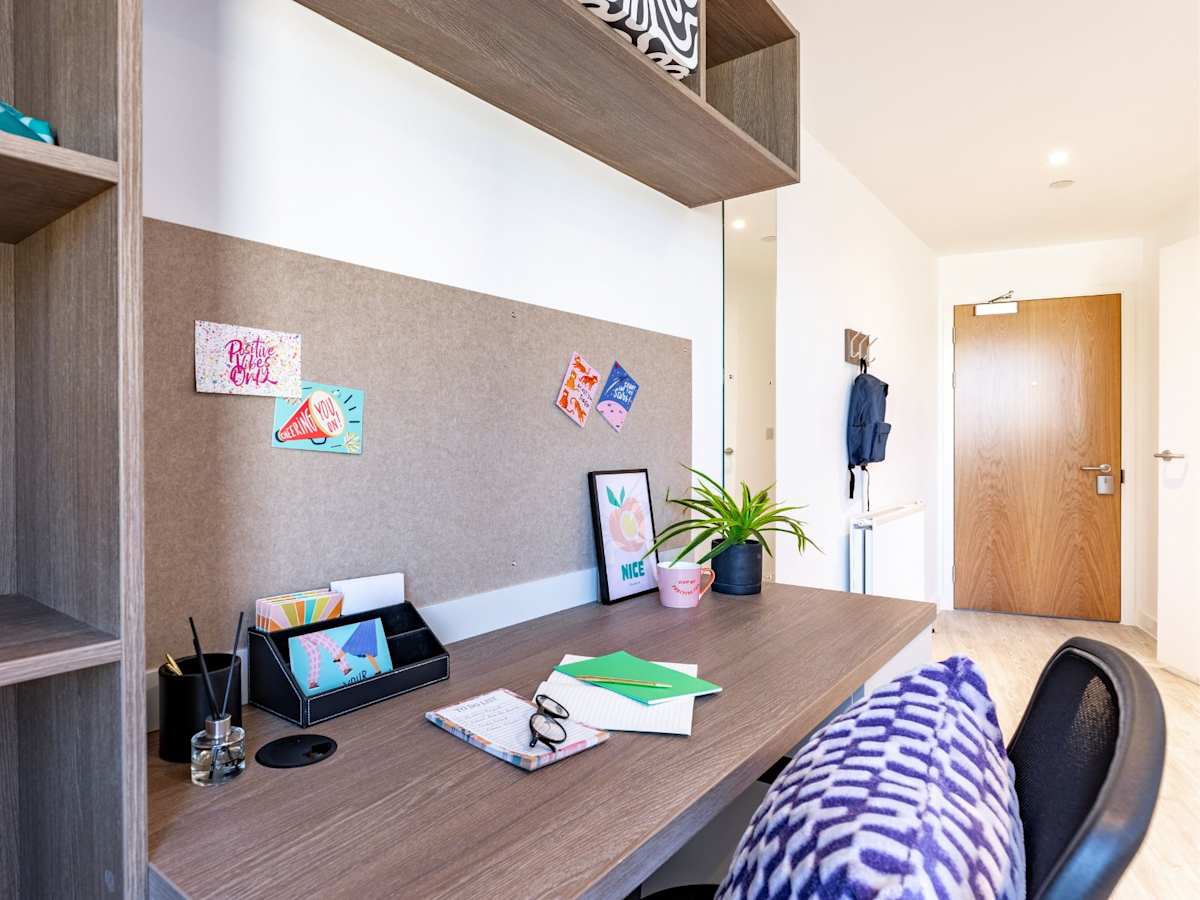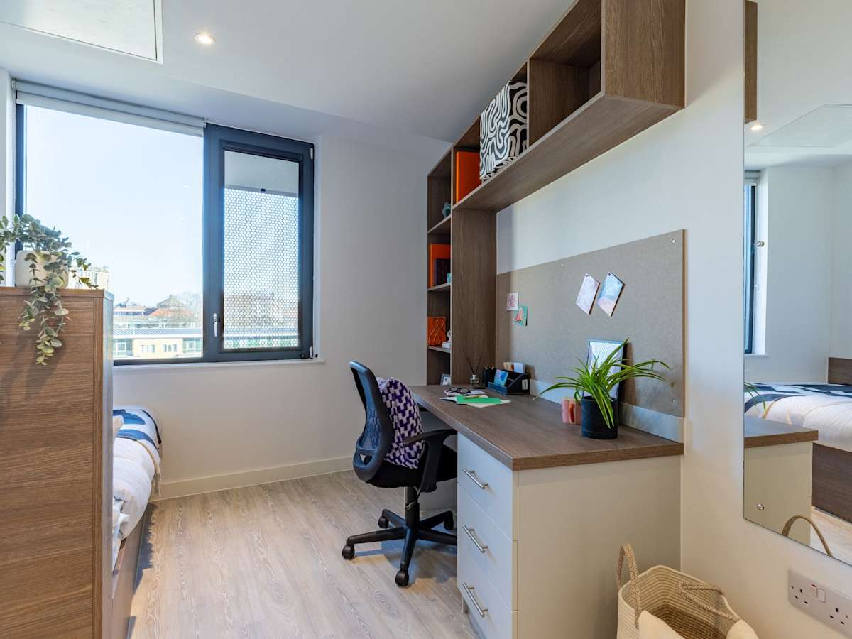 Glassworks accommodation offers fully furnished en-suite, twodio and studio apartments. All en-suite and studio rooms offer students an attached bathroom, a small double bed, a study area, and storage space. The studio rooms also features a private bathroom with a shower and a mini-kitchen with modern appliances. The twodios are cosy rooms with access to a kitchen.