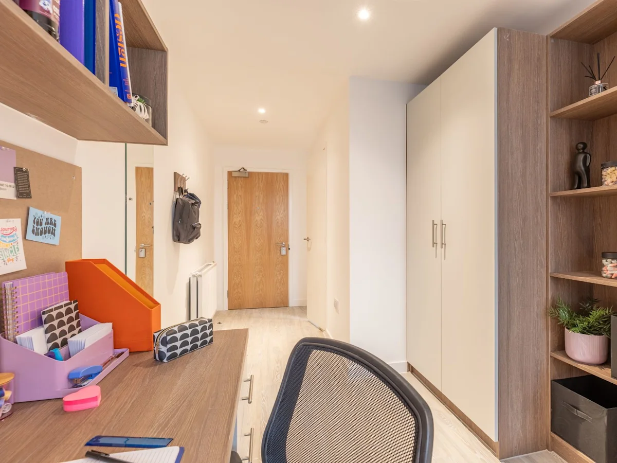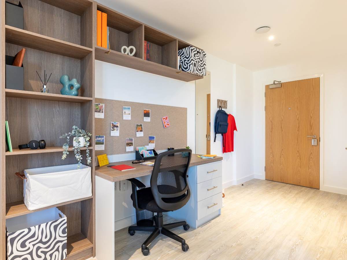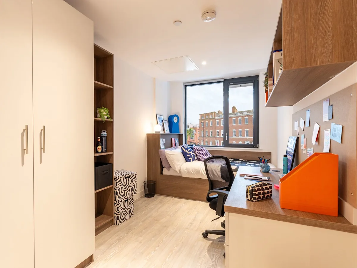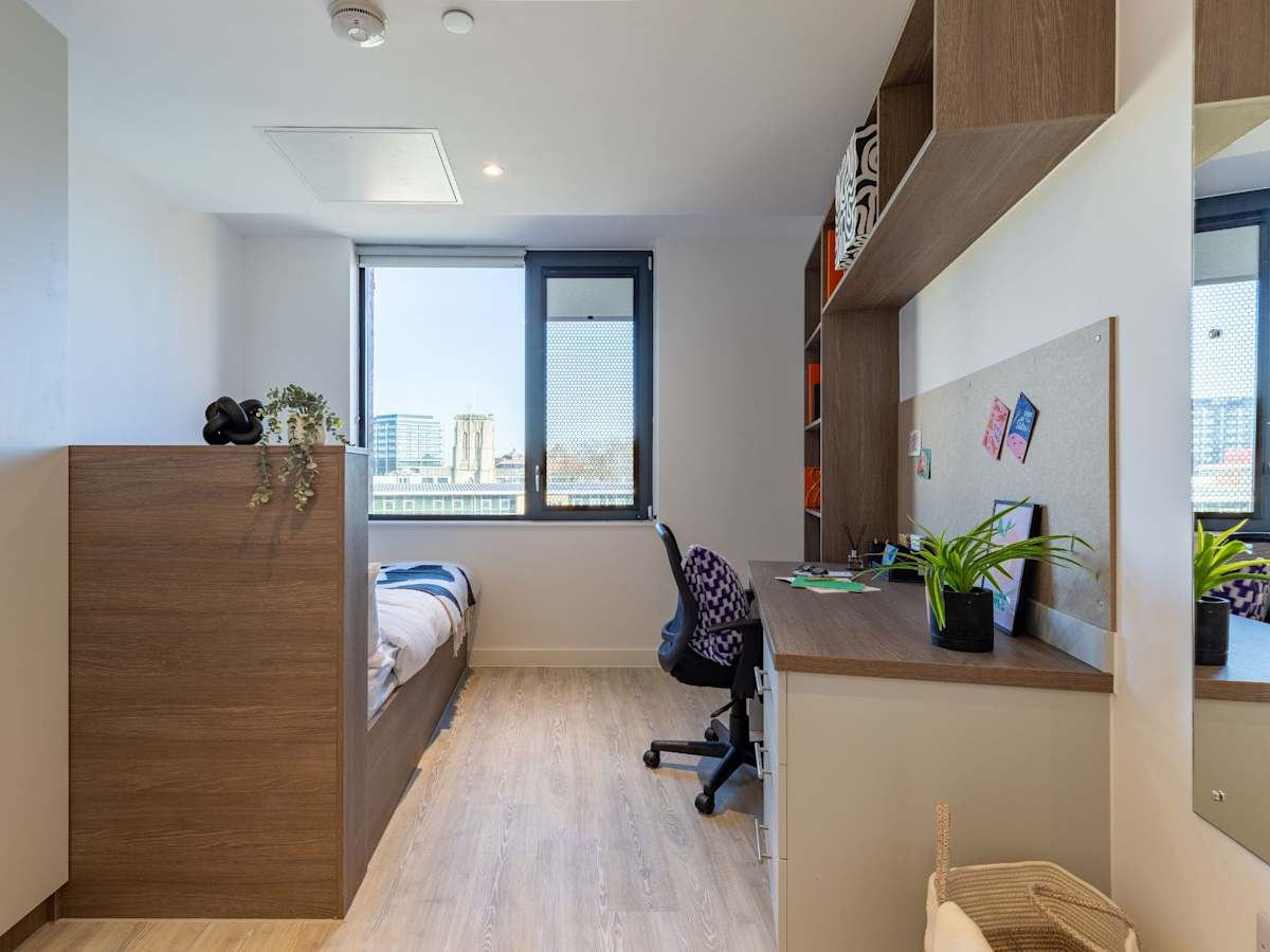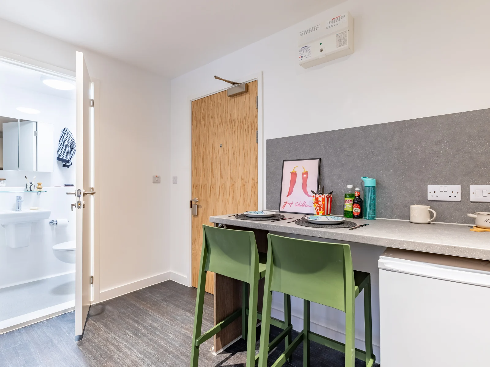 Glassworks accommodation offers fully furnished en-suite, twodio and studio apartments. All en-suite and studio rooms offer students an attached bathroom, a small double bed, a study area, and storage space. The studio rooms also features a private bathroom with a shower and a mini-kitchen with modern appliances. The twodios are cosy rooms with access to a kitchen.