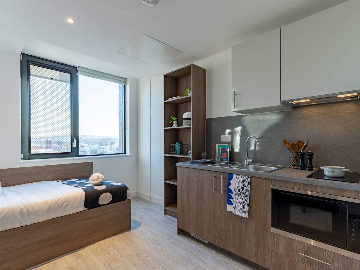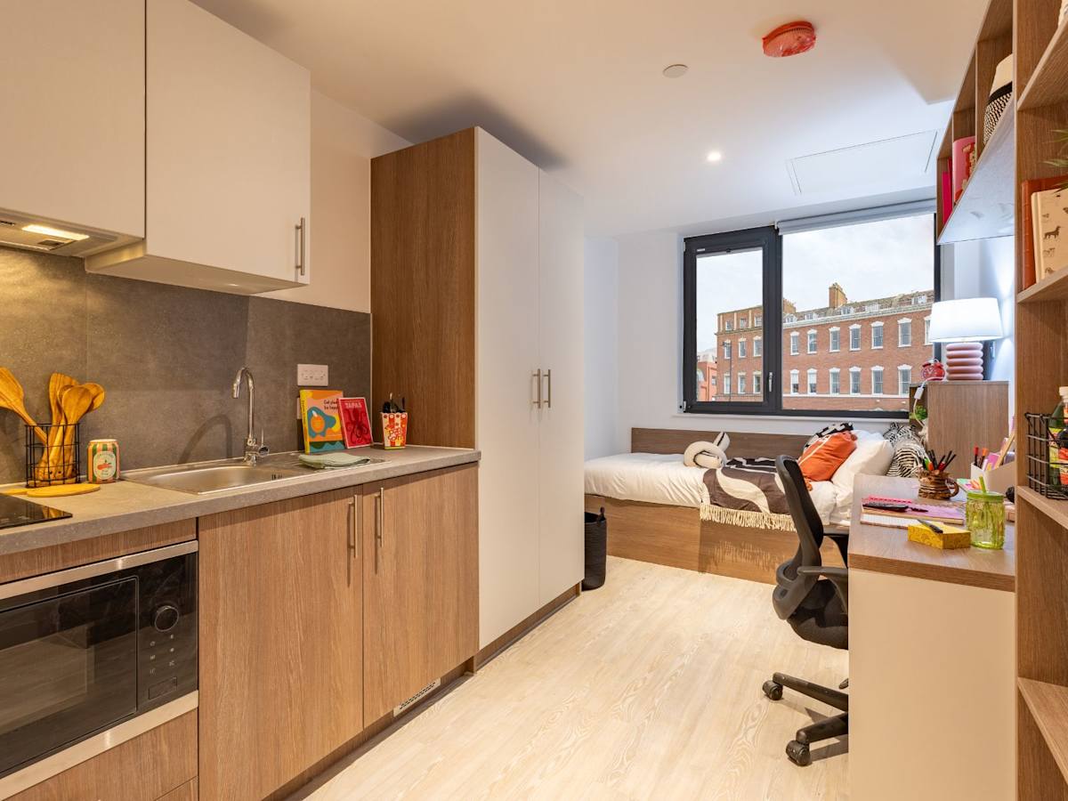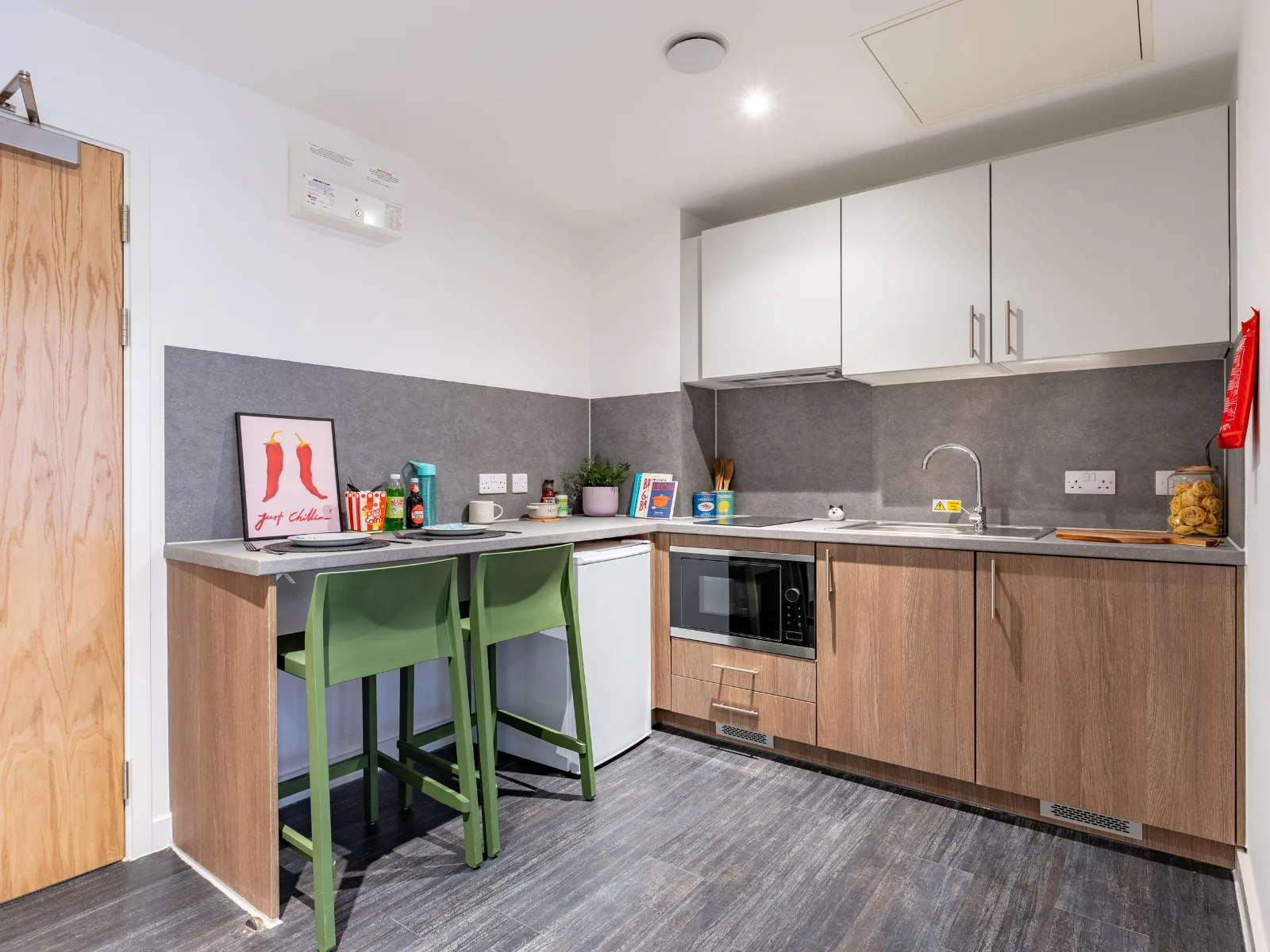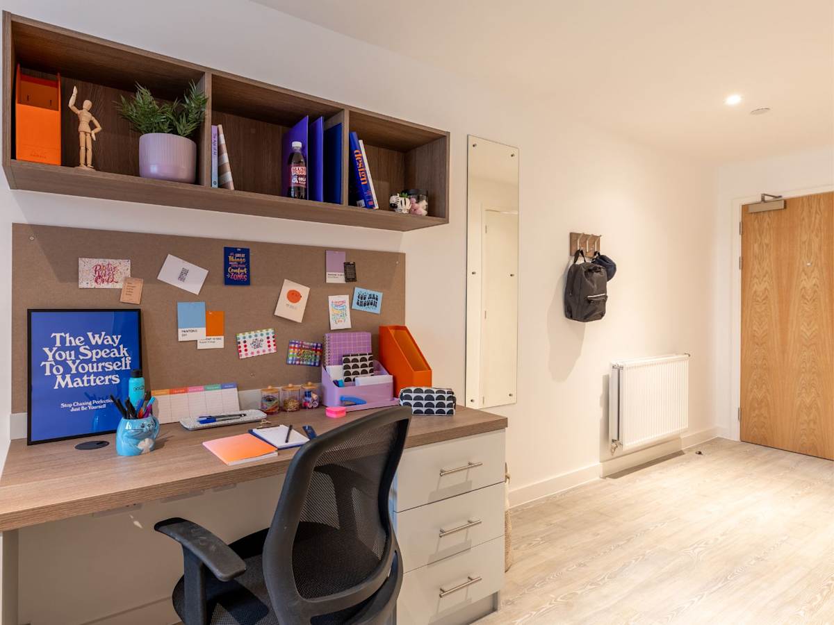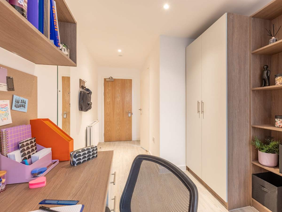 Glassworks accommodation offers fully furnished en-suite, twodio and studio apartments. All en-suite and studio rooms offer students an attached bathroom, a small double bed, a study area, and storage space. The studio rooms also features a private bathroom with a shower and a mini-kitchen with modern appliances. The twodios are cosy rooms with access to a kitchen.