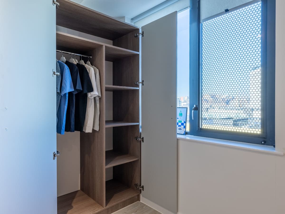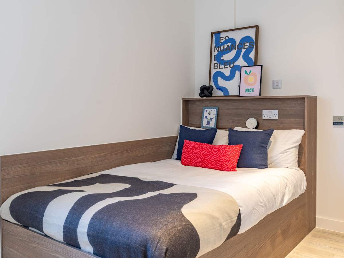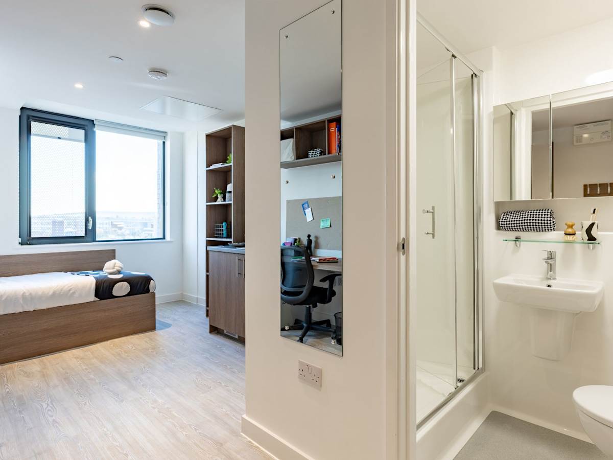 Similar features of a Bronze En Suite but with more space. Approx. 16sqm, enjoy your own en suite shower room, comfortable small double bed, study space and loads of storage. Plus, meet your flatmates in your spacious shared kitchen and lounge area, kitted out with a TV.