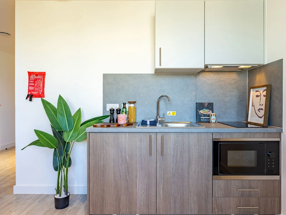 Our studios feature a comfortable small double bed, plenty of storage and a dedicated workspace. Enjoy having your very own private en suite shower room, and your own mini-kitchen, equipped with all the essential appliances. Our Bronze studios offer approximately 17 sqm of space.
