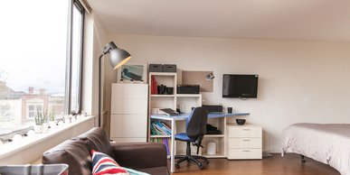 32m2 Double bed En-suite with shower cubicle Washer /dryer Heated towel rack Built in large double wardrobe with sliding doors Extra cupboard storage space Two bedside drawers Chest of three drawers Breakfast Bar with stools Kitchen area complete with electric oven with four ring hob Hood extractor fan Built in dishwasher Full mirror Study desk with chair and storage shelving Two seater sofa TV (licence not included) Intercom Higher floor studios subject to availability.