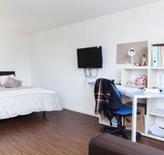 45m2 Large bedroom Separate living room Double bed En-suite with shower cubicle Washer /dryer Heated towel rack Large free standing wardrobe Large built in wardrobe Two chests of three drawers Kitchen area complete with electric oven with four ring hob Hood extractor fan Built in dishwasher Full mirror Study desk with chair Two seater sofa TV (licence not included) Intercom