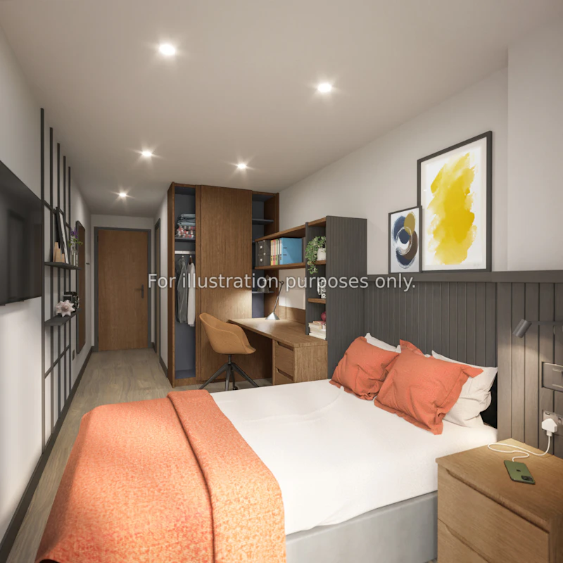 The Deluxe Ensuite is a spacious and comfortable student accommodation, offering a generous living space. It is equipped with a small double bed, a personal study desk, ample storage, and a private ensuite with modern facilities. This room is designed to provide students with a relaxed and inviting environment, allowing them to study, unwind, and enjoy their time in a comfortable setting.