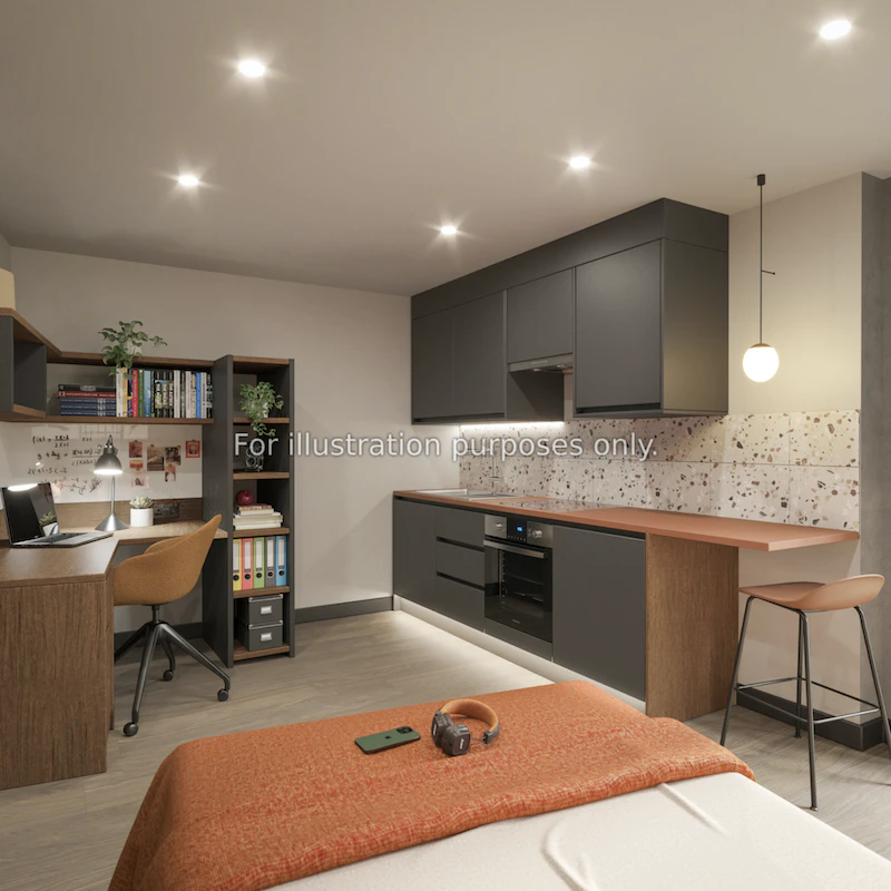 The Bronze Studio is a cosy and well-equipped student accommodation, typically located on the lower ground floor, offering a living space ranging between 16.3 – 19.7 sqm. It features a comfortable small double bed, an ensuite bathroom, a study area, and your own kitchen equipped with a cooker and oven, providing students with a private and functional living environment.