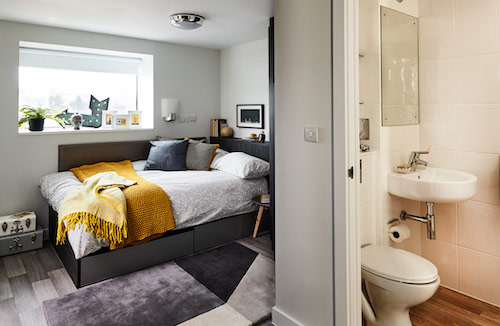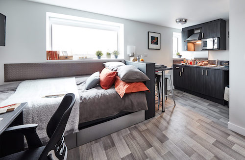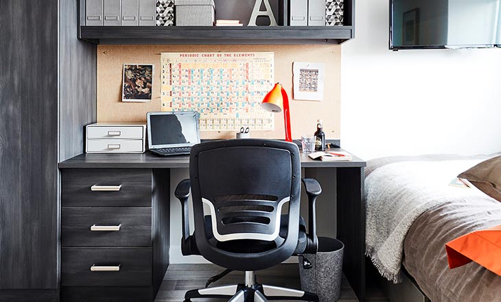 A private 14-15.5m2 bedroom (and your own private bathroom) within a 2-bedroom interconnecting studio 32” television in each bedroom (licence not included) 4ft double bed with under bed storage Double USB chargers Privacy lock at interconnecting door Well-designed desk space Luxury mesh-backed adjustable study chair Pin-board Desk Light Double wardrobe with shelves and full-length mirror