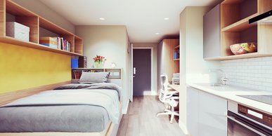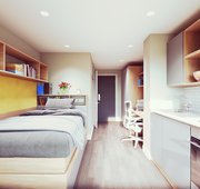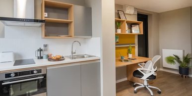 Communal kitchen and living space. Small double bed, wardrobe, desk and chair Open plan living room/ kitchen area En-suite shower room, WC & basin