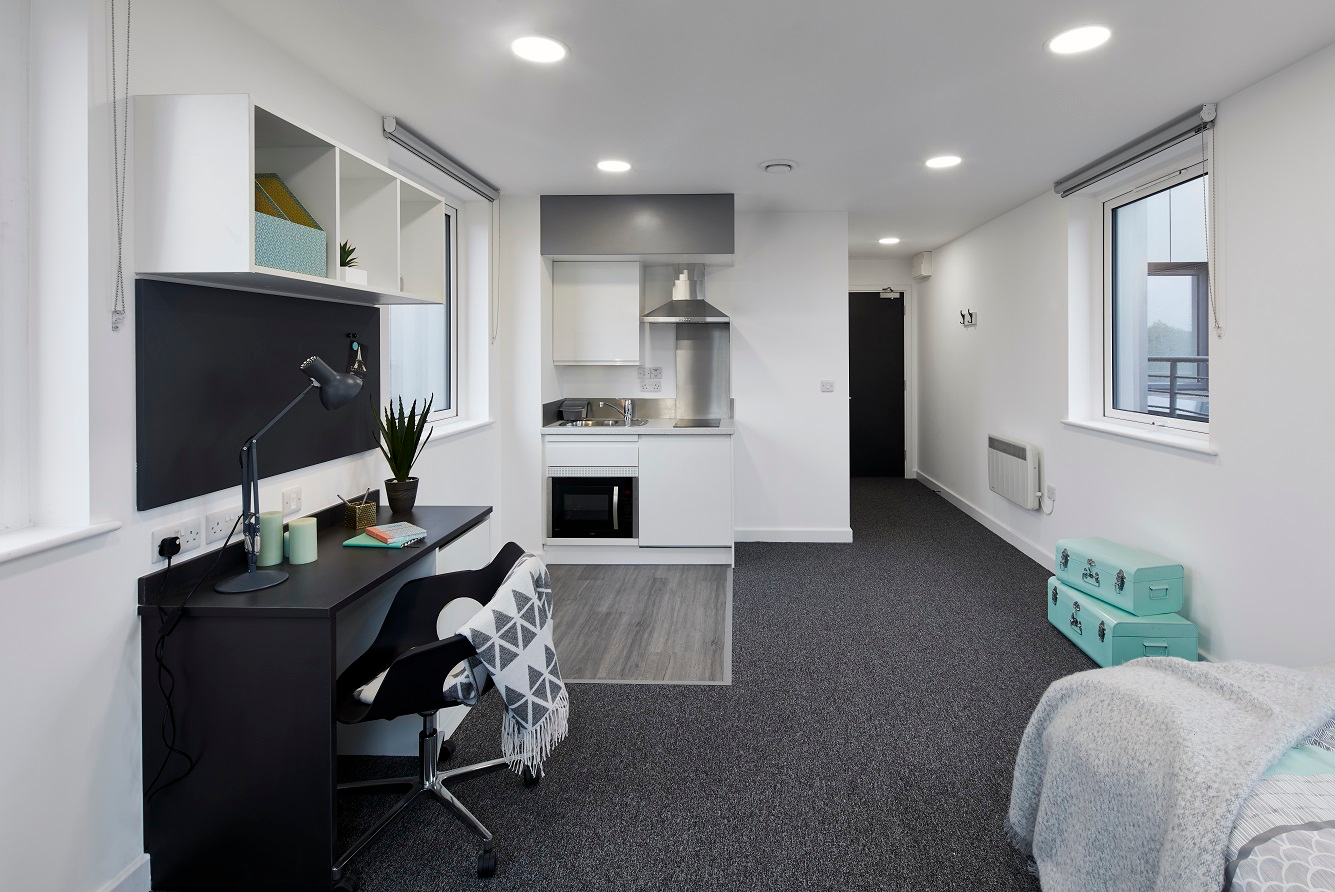 Room sizes can vary from 24.30m2 to 31.20m2. Wireless internet access 2 ring ceramic hob A combination microwave/oven Combined fridge/freezer Under bed storage En-suite with shower Private modern kitchen Wardrobe with mirror Study area with desk, chair and shelves Over-bed reading light Desk lamp Magnetic notice board