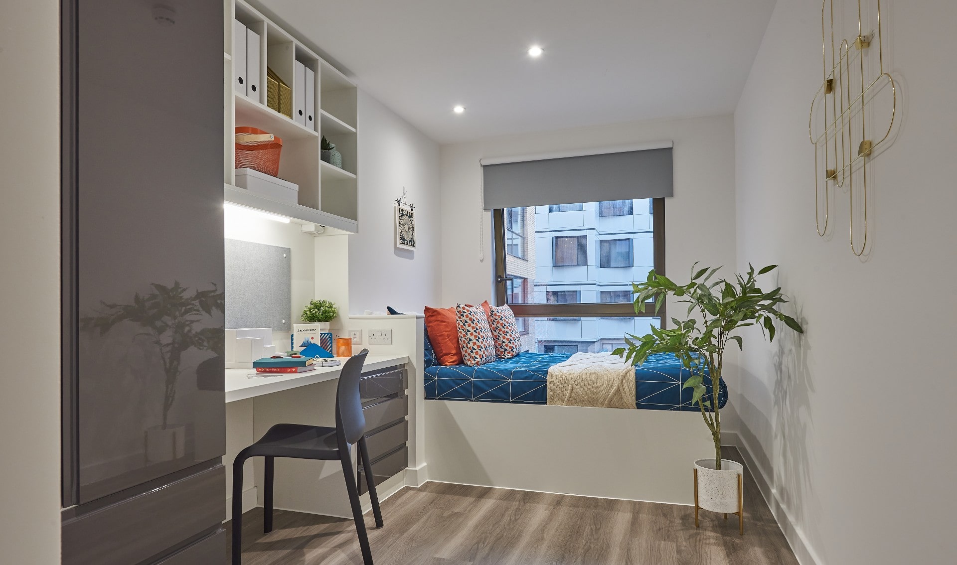 Room Size: 13.93sqm – 14.92sqm, Our most affordable en-suite student room, fitted with all of our useful standard features plus a shared social space and kitchen to share with your flatmates.